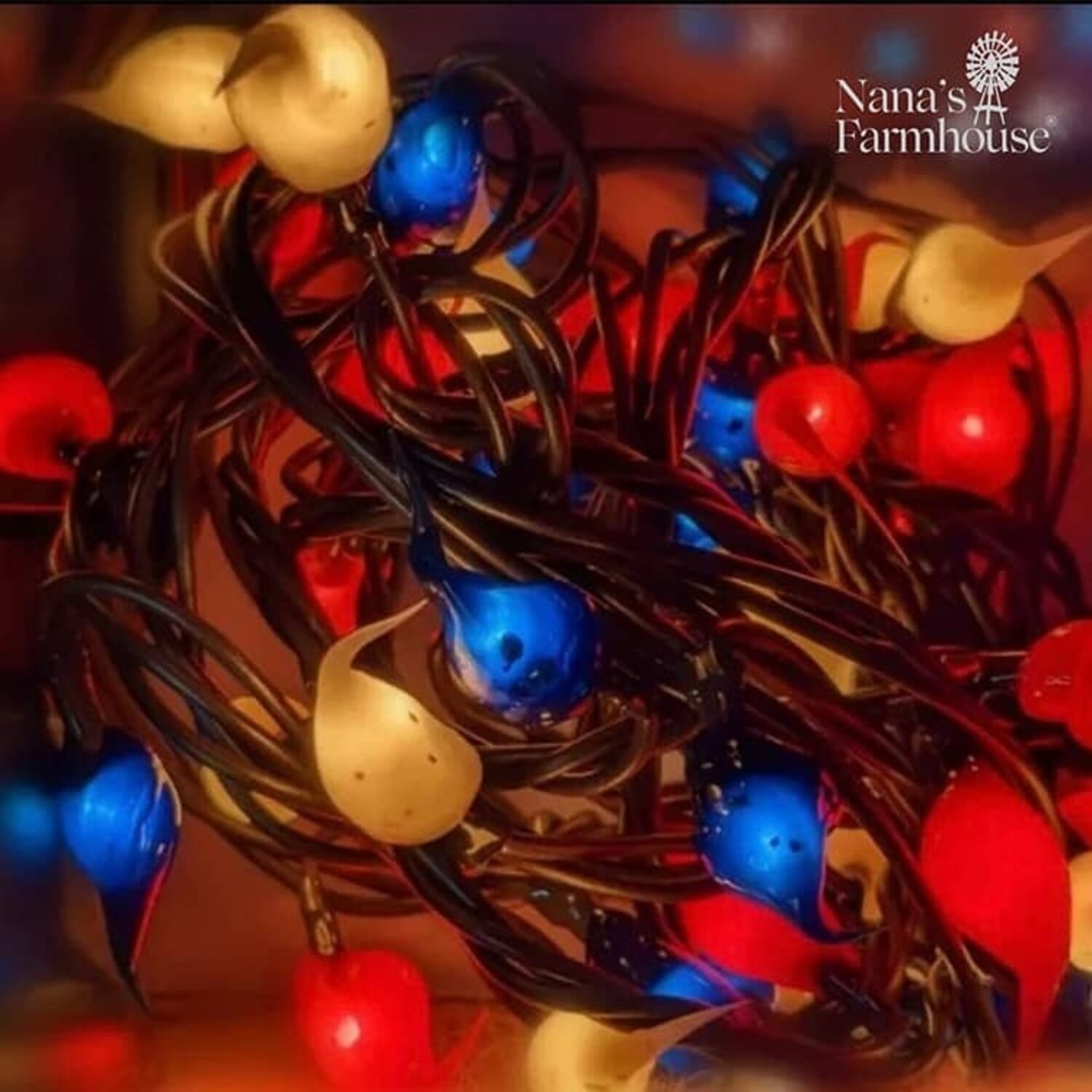 Add a Patriotic touch with the America Rice Lights, also called Teeny Lights. These are electric lights for indoor use. Each bulb handcrafted individually. 100 count long string lights has a plug on one end only.