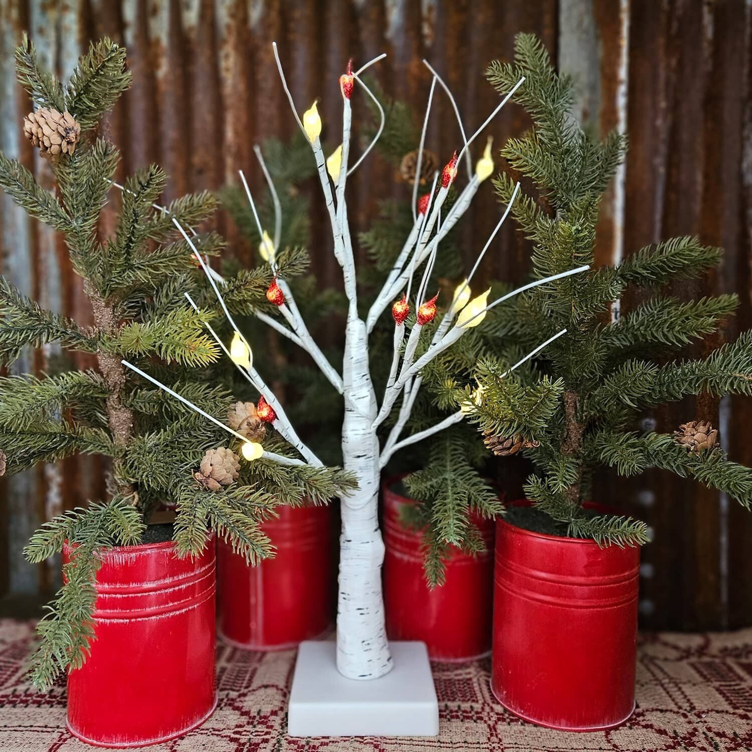 Add a Holiday accent with the Peppermint Stick Birch Tree with lighted branches. Features 18 bulbs and stands 20" tall.