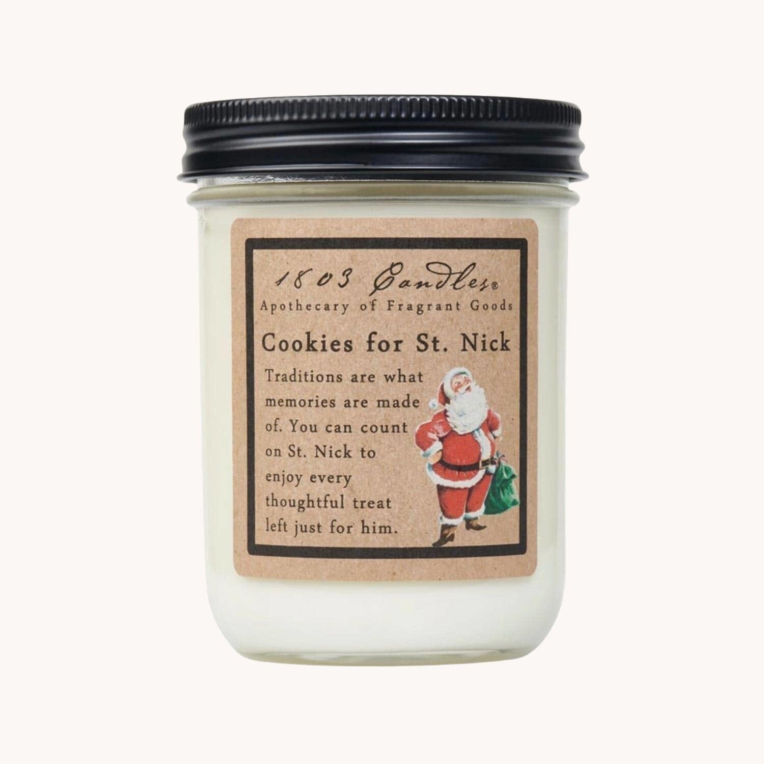 The 1803 Cookies For St. Nick Candle reminds you of the excitement of preparing for St. Nick. The scent of snickerdoodle cookies made with sugary caramelized vanilla, warm spice, and country-churned butter; filling his belly before he disappears.