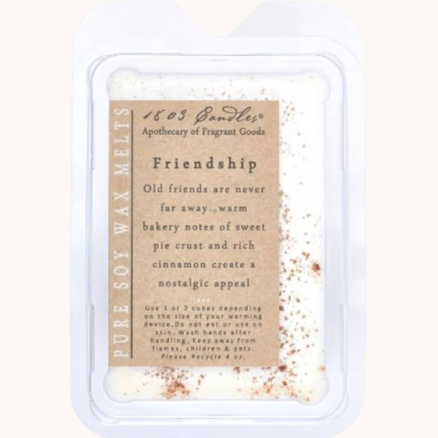 Availability: In Stock$8.99Celebrate a friend with the 1803 Kindred Spirit Melter fragrance layered with vanilla rum cake, praline strudel, nutmeg, cinnamon, & crushed gingersnaps with a sweet buttercream glaze. Pure 100% soy wax cubes are to be used in an electric wax warmer.