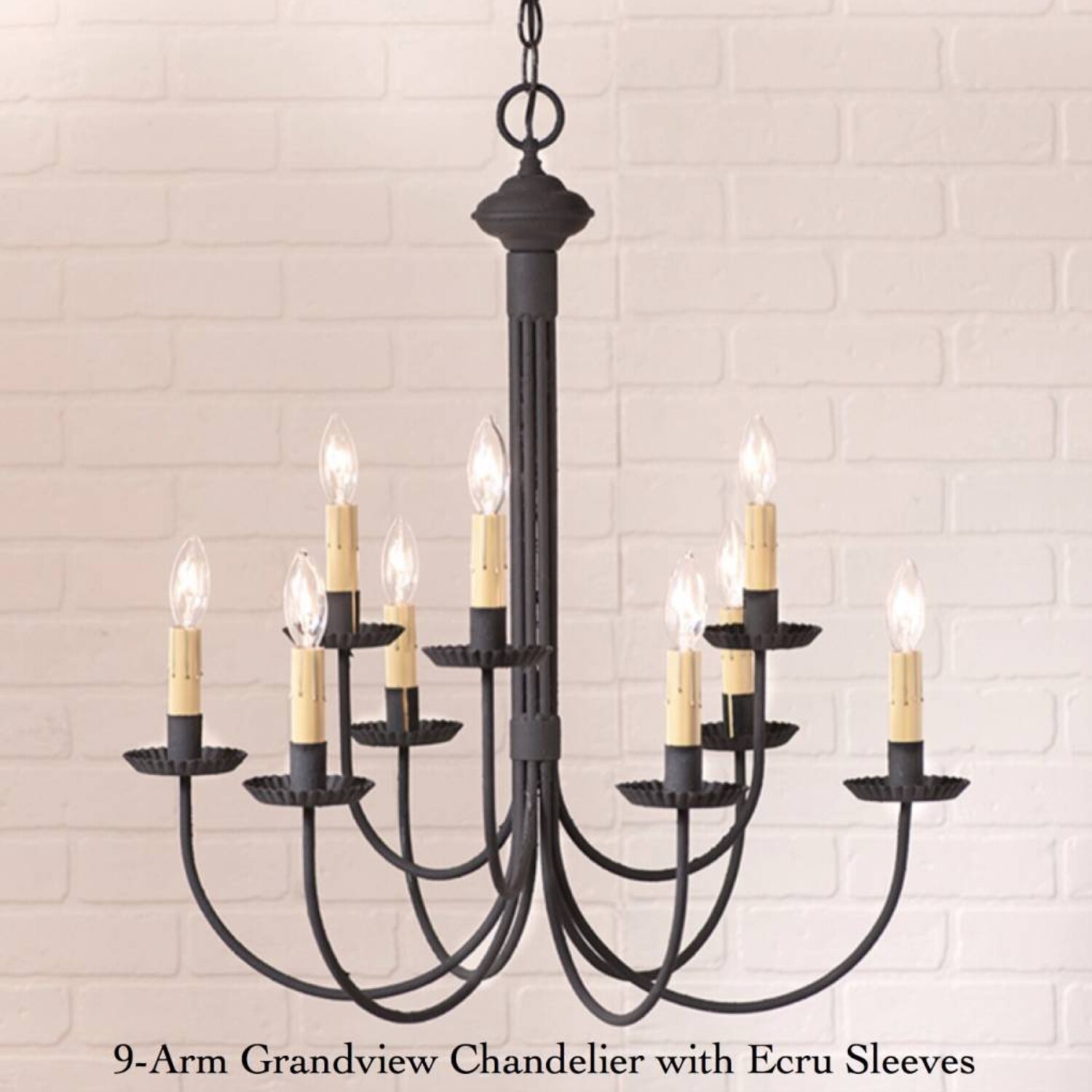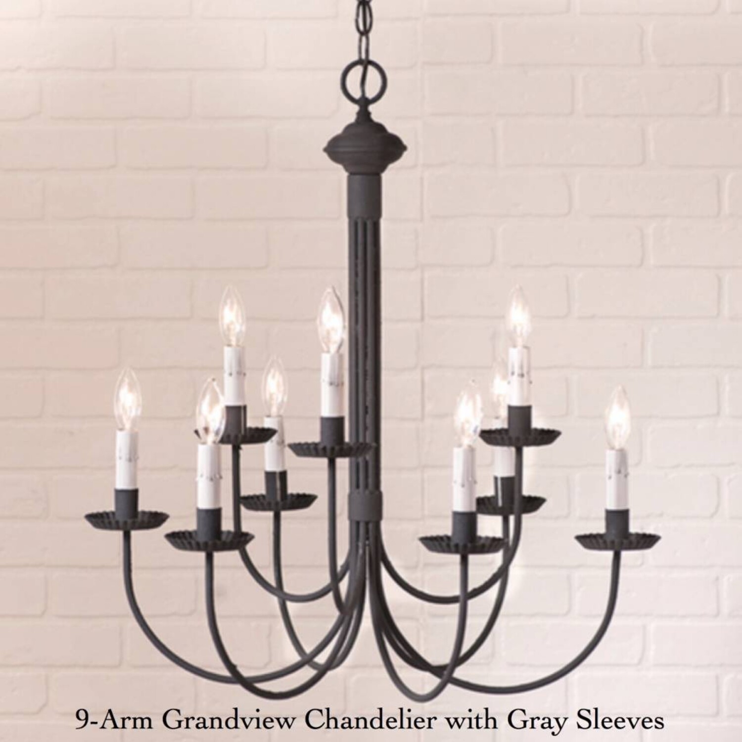 Bring a traditional & formal touch with the 9-Arm Grandview Chandelier in textured Black to your home. This beautiful chandelier is a wonderful choice to illuminate your dining area or in a foyer. Available with Gray or Ecru sleeves. Made in the USA.
