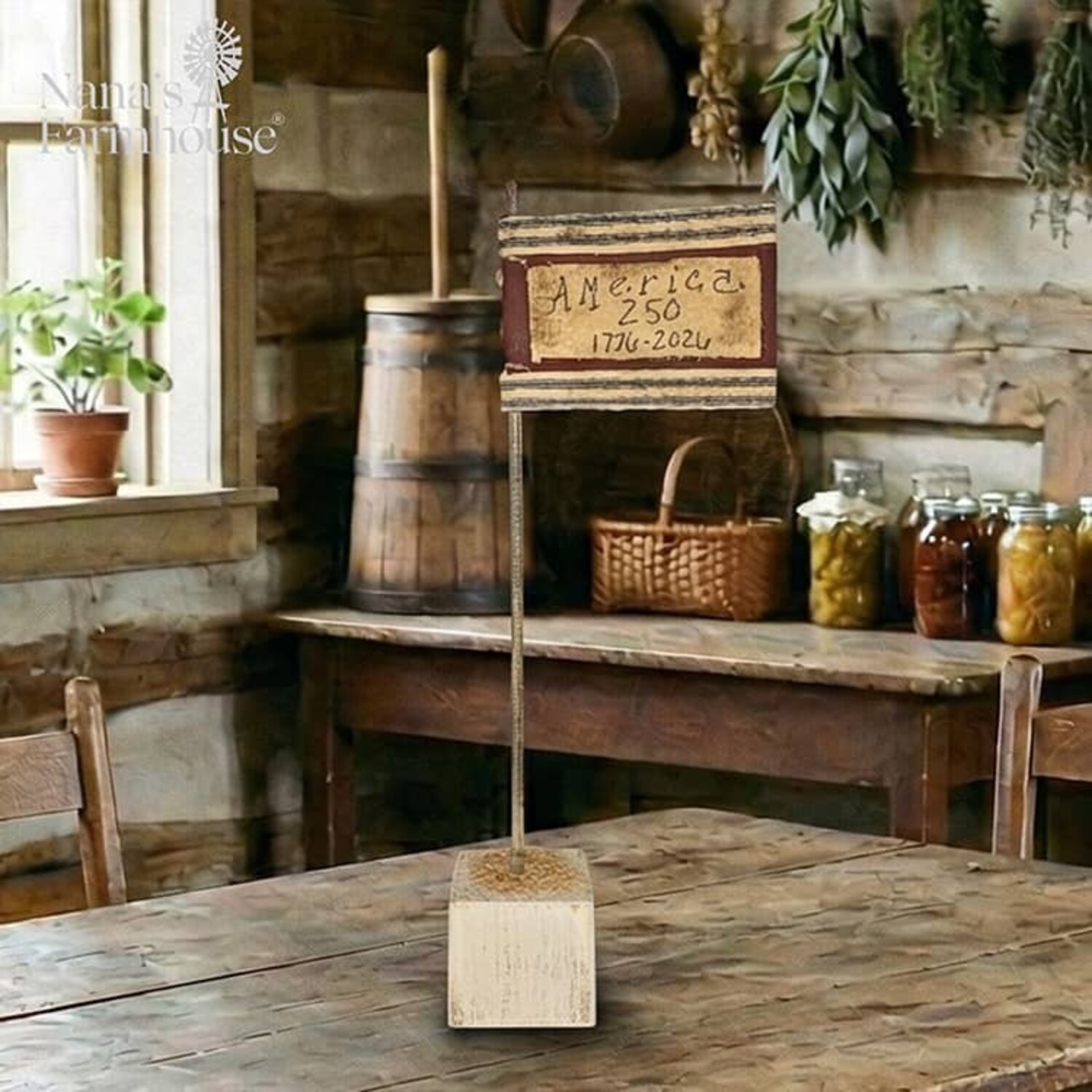 Rustic America 250th 1776-2026 Flag is the perfect addition for your tabletop, entryway or shelf decor. Handmade in the USA. Stands 20.5" Tall.