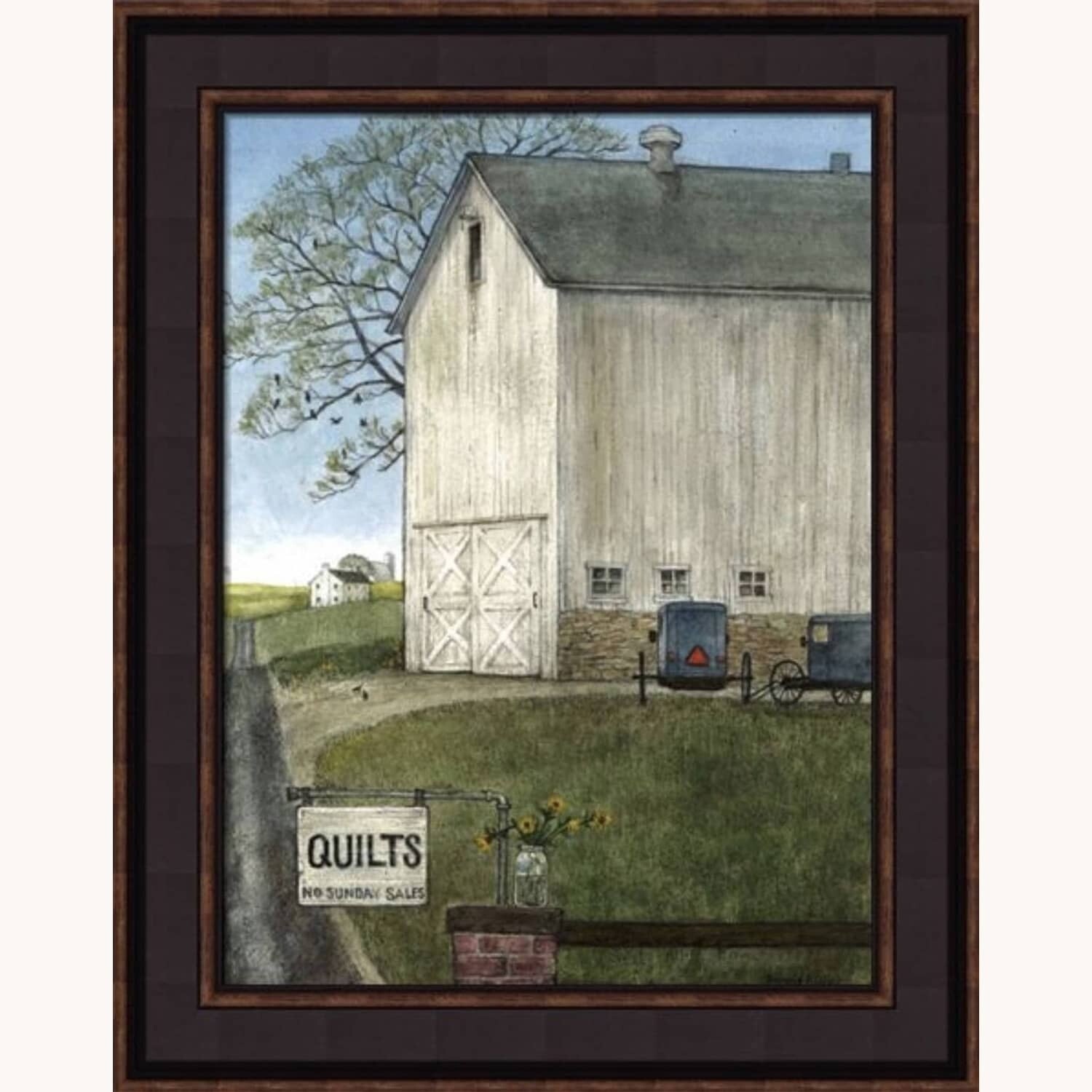 Just like many places in Lancaster County this print captures the Amish buggies parked outside the white barn where they sell their handmade quilts with the rolling hills in the background.