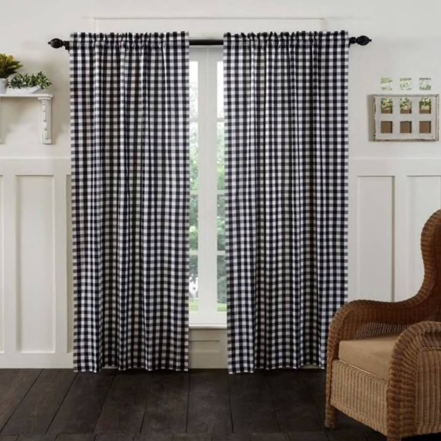 Refresh your farmhouse style with the Annie Buffalo Black Check Panel Set. Let in the sun today (or keep it out if you prefer). Create a relaxed country look for your windows. 100% cotton, lined. Includes two matching tie-backs.