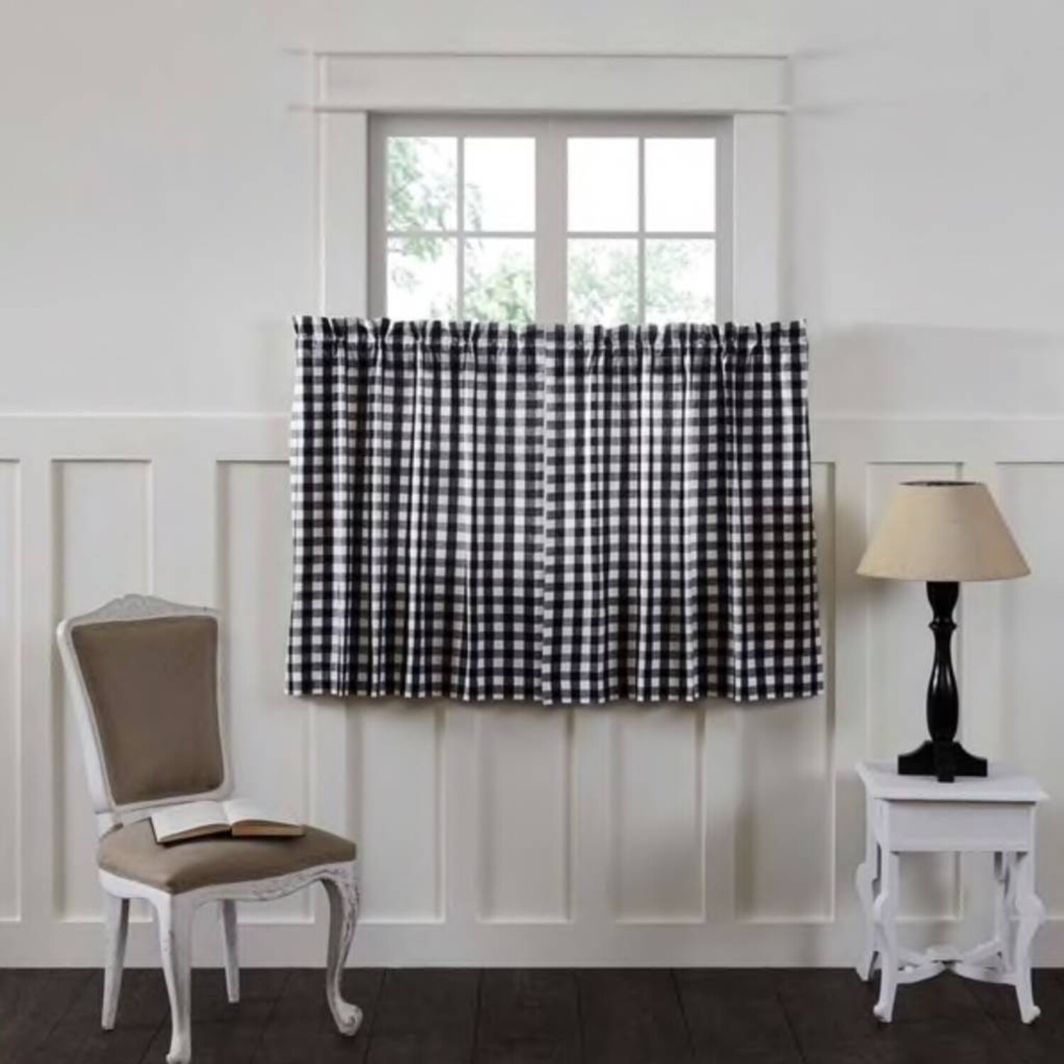 Availability: In Stock$49.95No need to wait until tomorrow, with the Annie Buffalo Black Check Short Panel Set . Let in the sun today (or keep it out if you prefer). Create a relaxed country look for your windows. 100% cotton, lined. Includes two matching tie-backs.