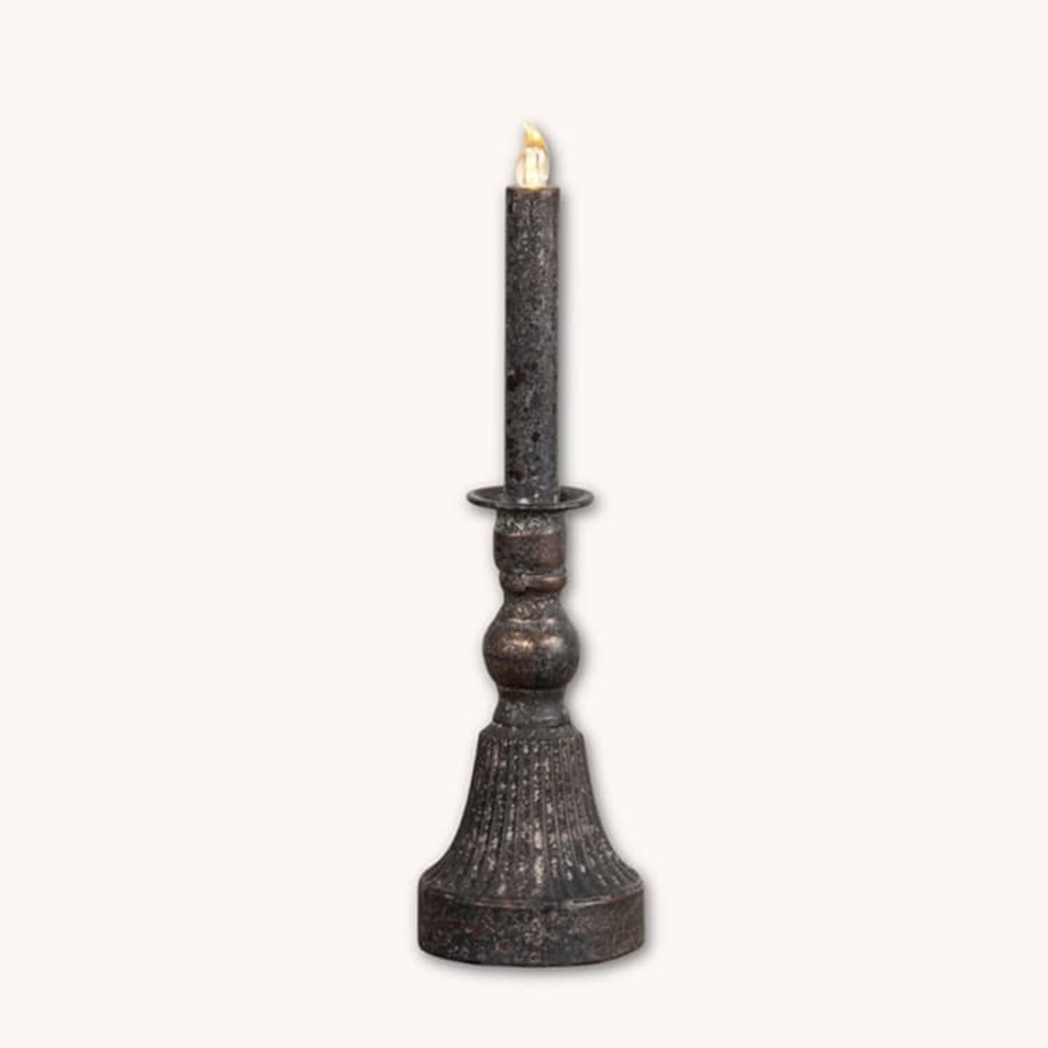 Stunning Black Candlestick is battery-operated. Made of metal. Requires 2 AA batteries, not included.