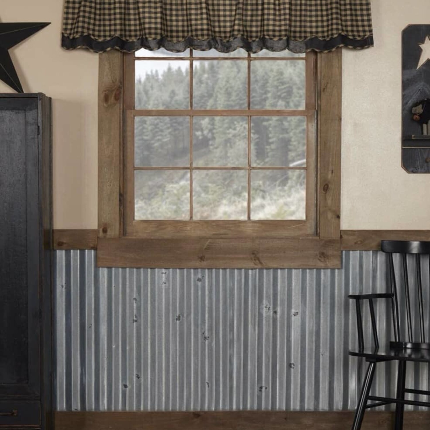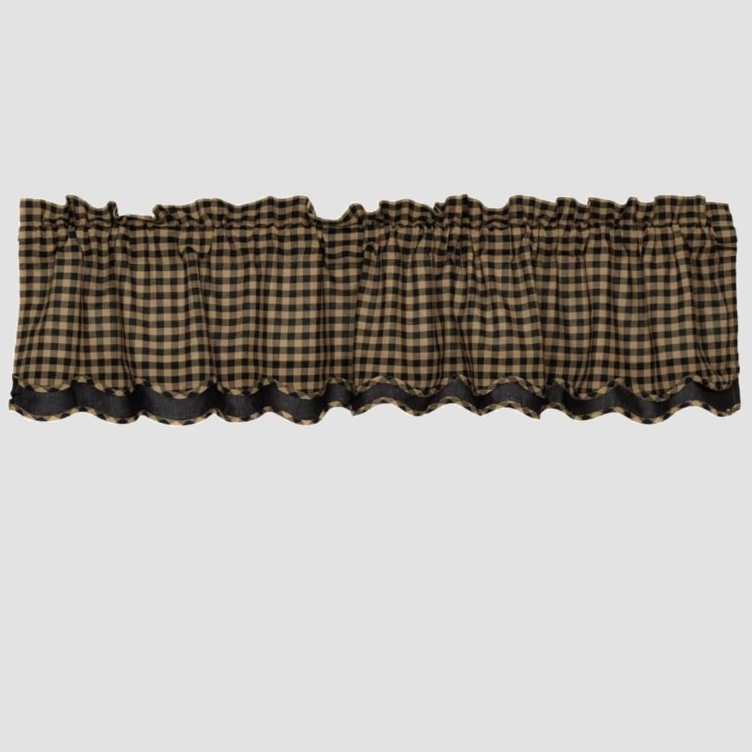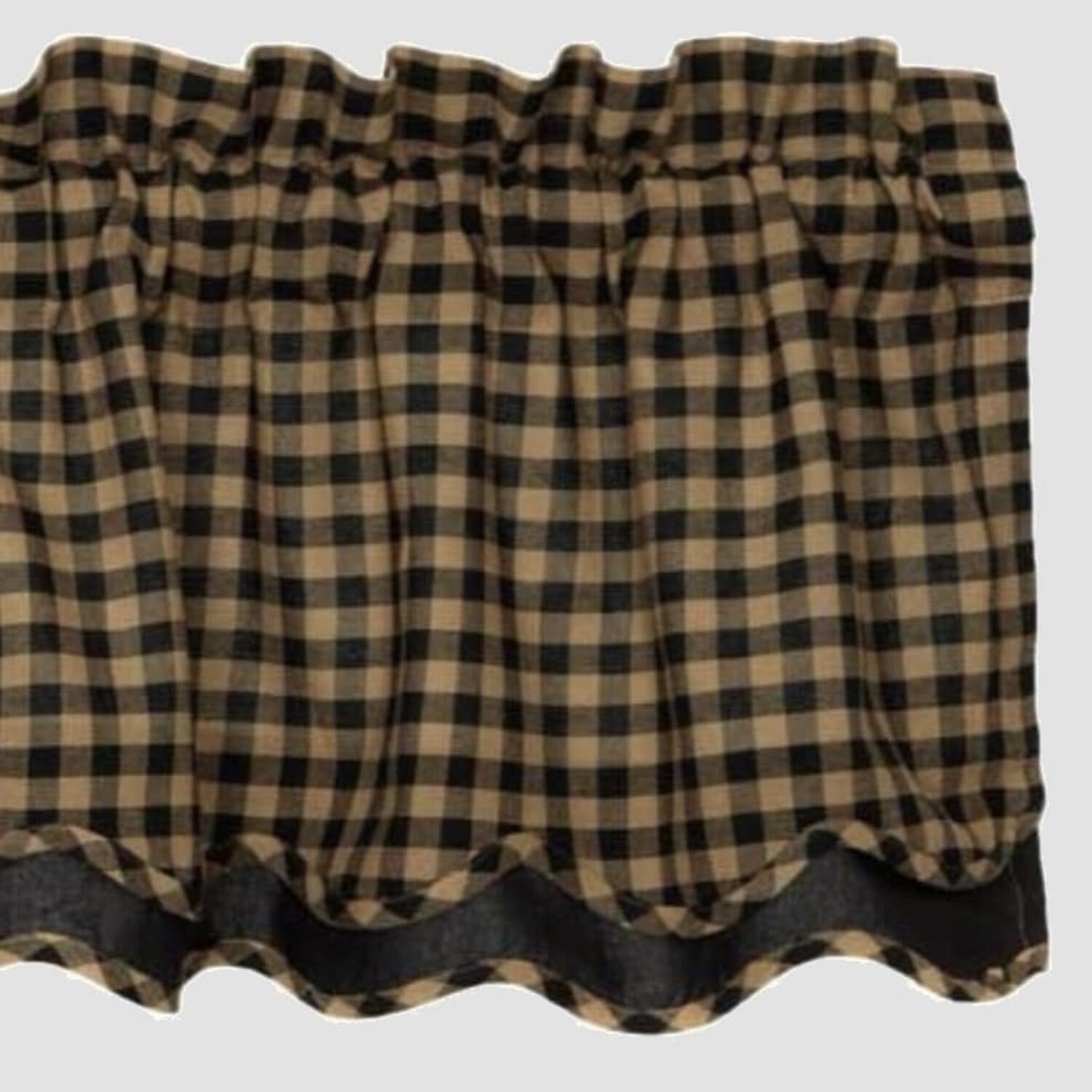 Black and khaki checks are blended with faded texture at points of intersection to give a modern facelift to the classic pattern on the Black Check Scalloped Valance Layered Lined 72x16.