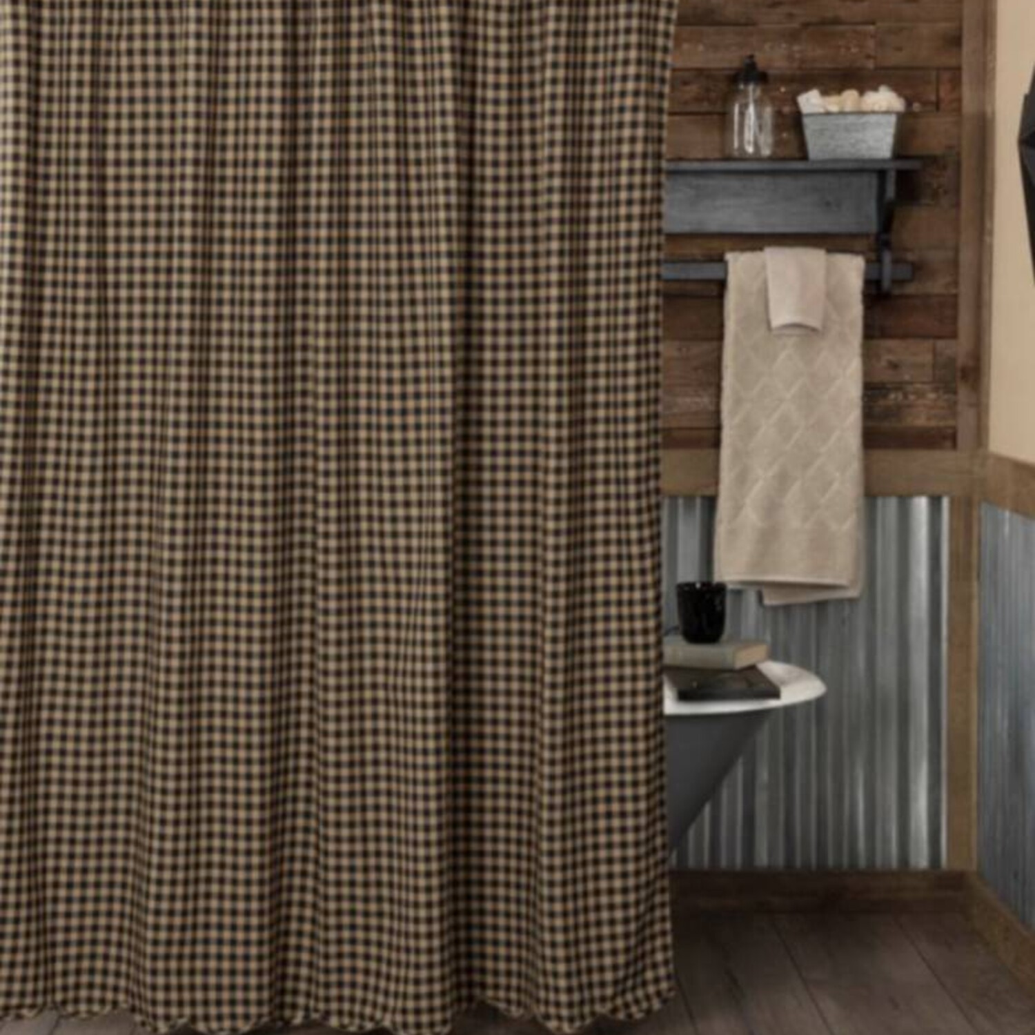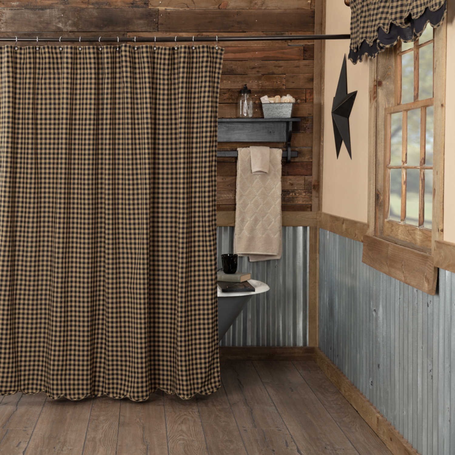 Complete your country style with the Black Check Scalloped Shower Curtain! This 72" x 72" has rich colors and is perfect for your primitive farmhouse It is machine washable cloth. Curtain hooks sold separately