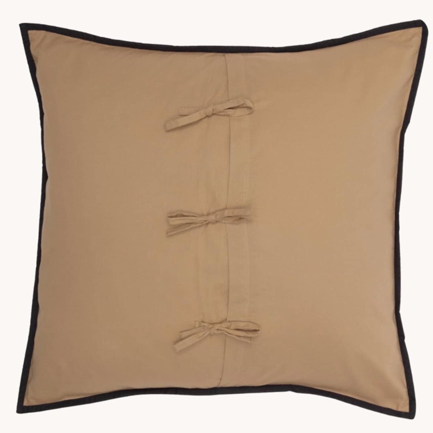 Availability: In Stock$22.95This country style accent pillow is the perfect addition to dress your bed. It contains a solid tan cotton fabric with large appliqued black 5-point star in center accented with check & plaid strips in black and tan on each side. 14" x 22".