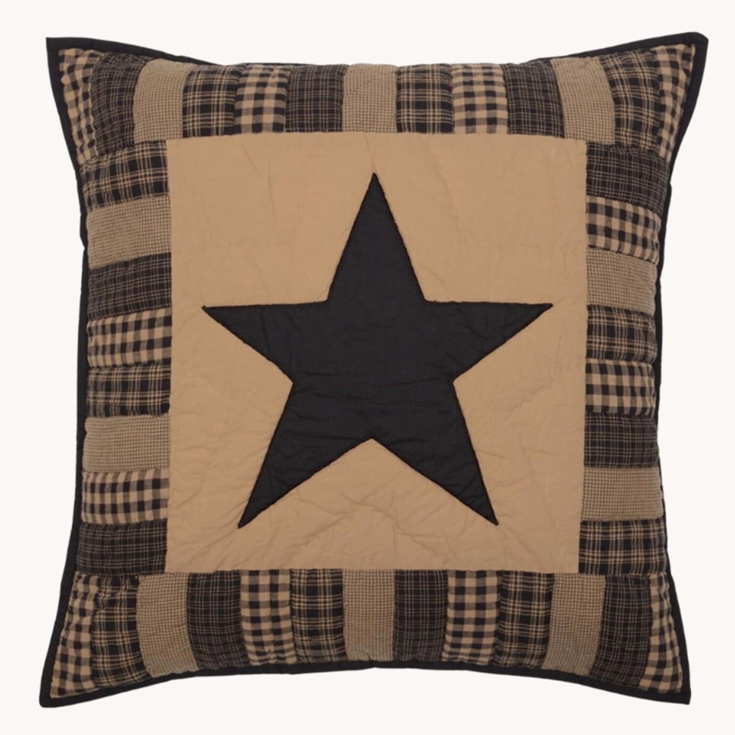 Availability: In Stock$26.95The Black Check Star Shams contain stitches in the ditch hand-quilting on check pattern, plaid, & solid cotton fabrics. This pillow sham contains a 5-point star applique centered on solid cotton fabric, accented with check pattern border. 100% cotton. Black Check Star Patch Pillow