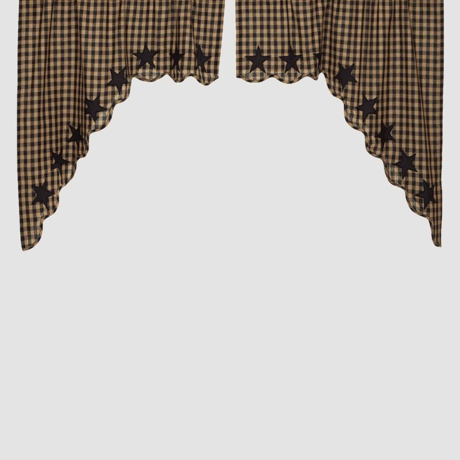 Bring a refreshed look to your country windows with the Black Star Scalloped Swag Set. This curtain features small black and tan checks with 5 Point stars appliqued along the scalloped edge in solid black Lined with white cotton.