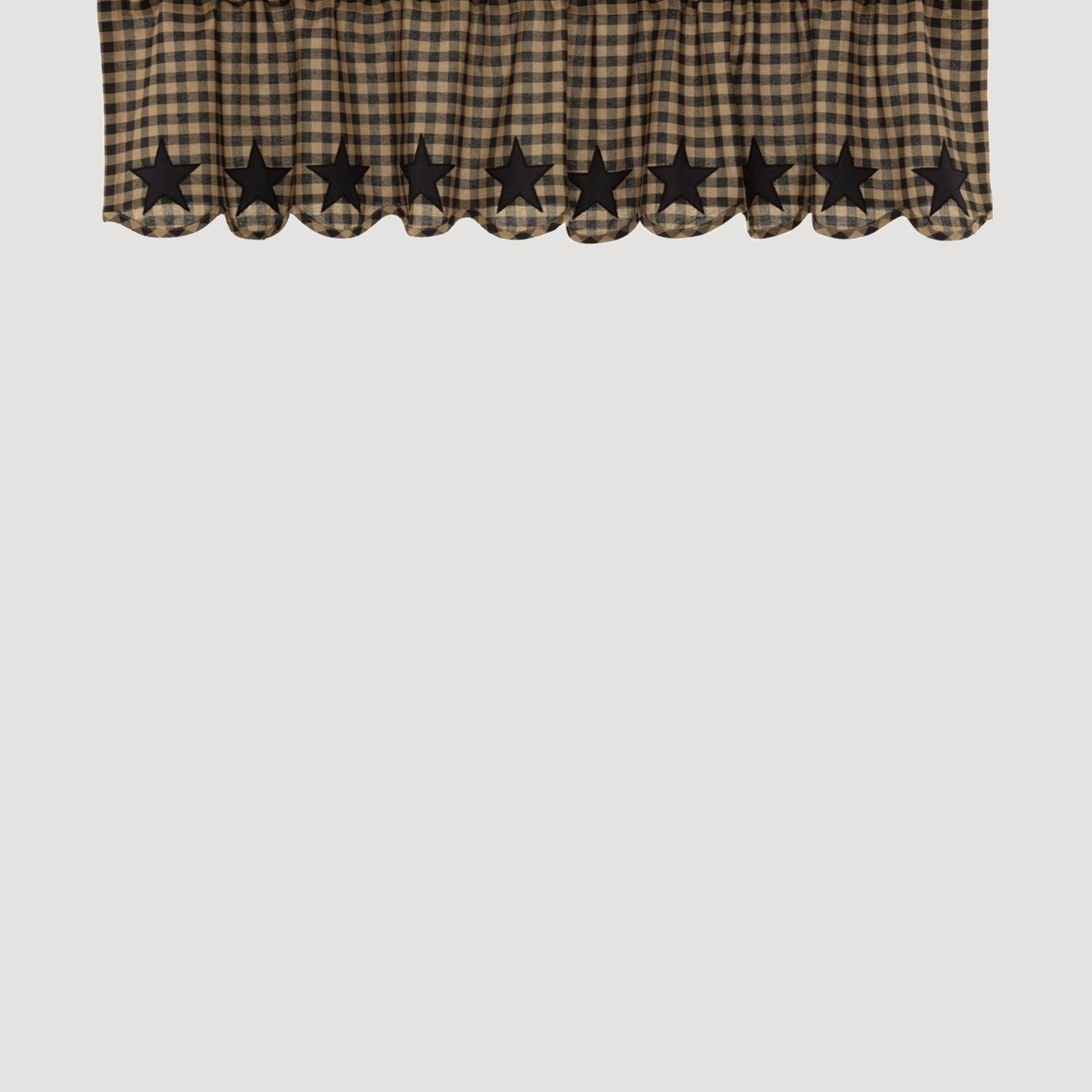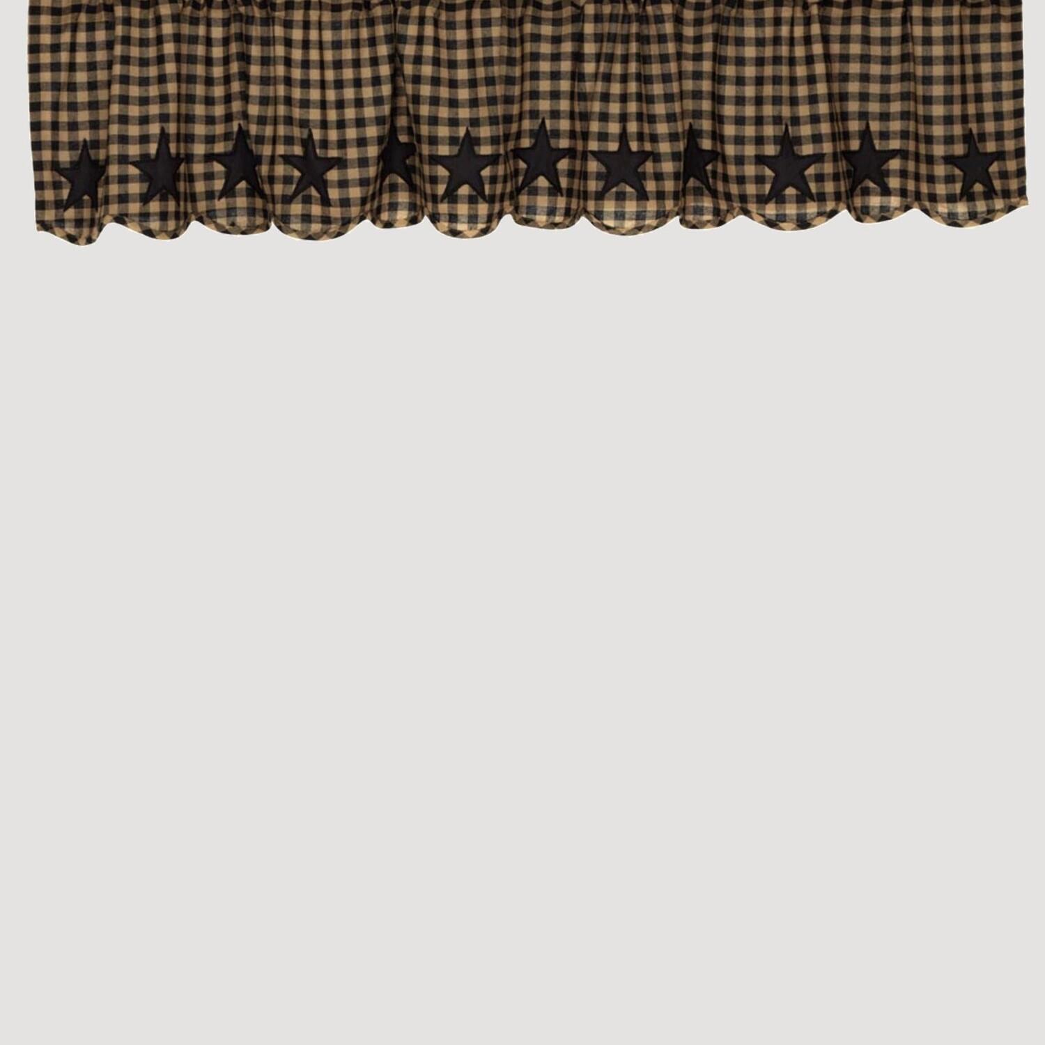 You'll love the rich colors of the Black Star Scalloped Valance. This country valance offers charming small black and tan checks with 5 Point stars appliqued along the scalloped edge in solid black. Lined with luxurious white cotton.