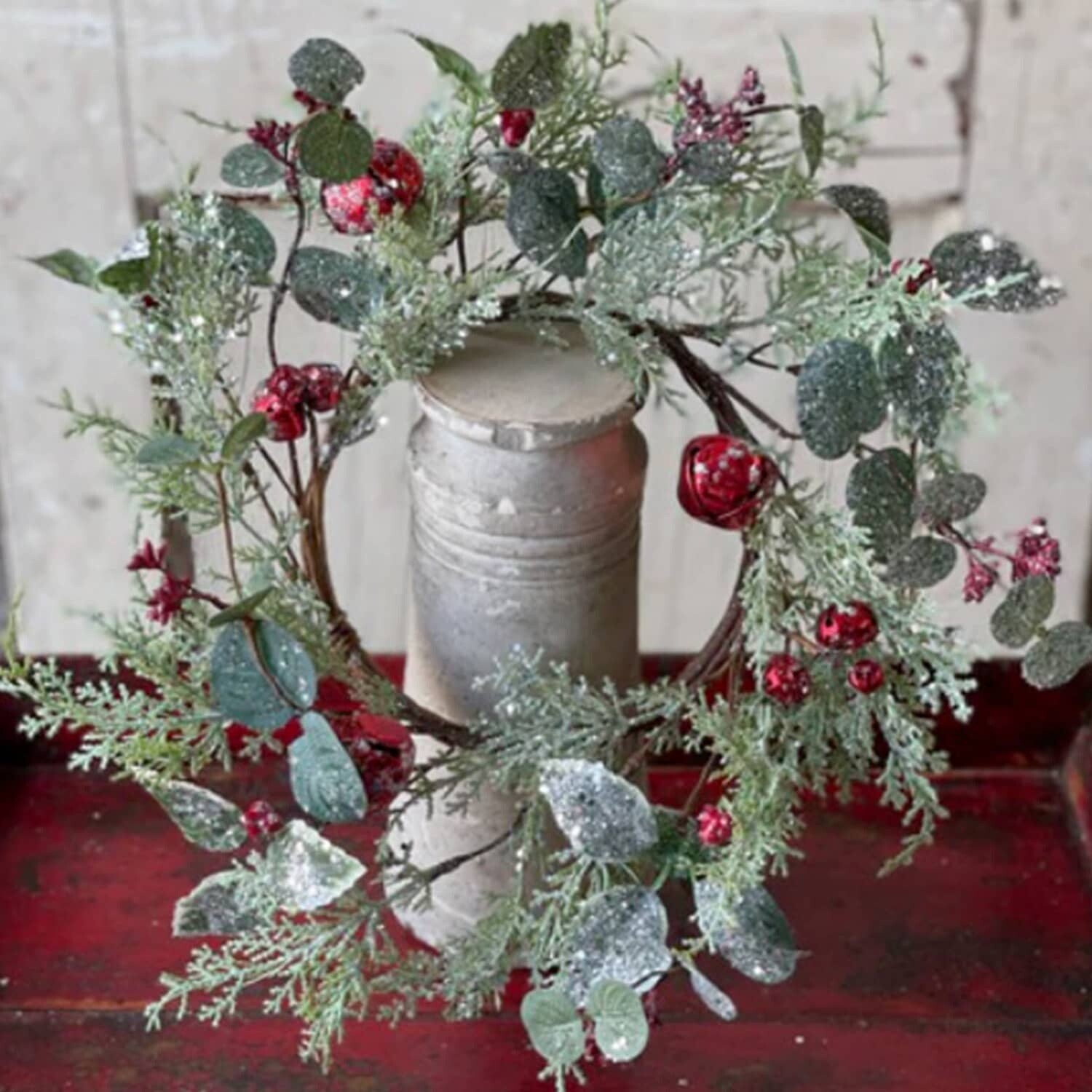 Eucalyptus, holly-like leaves, and pine are embellished with a snow finish and adorned with metallic bells and clusters of red berries on the unique Blizzard Bliss Bells Candle Ring. In stock and ready to ship.
