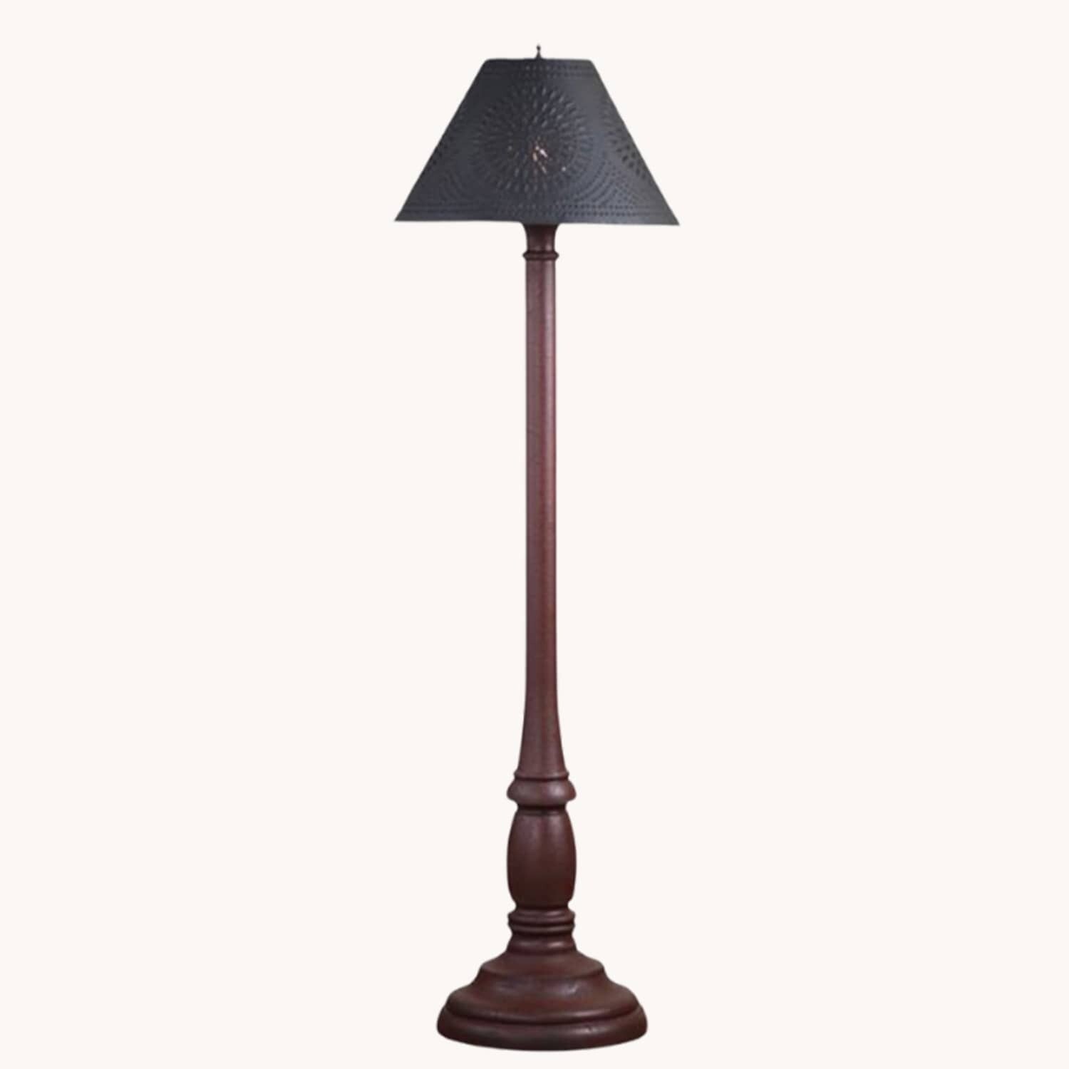 Hand painted and lightly distressed finish. Has 1 standard socket, 150 watts max. Includes a Textured Black metal 17 Inch shade. Has a 7-foot cord, 8 Inch harp and finial. Solid wood construction. USA made.