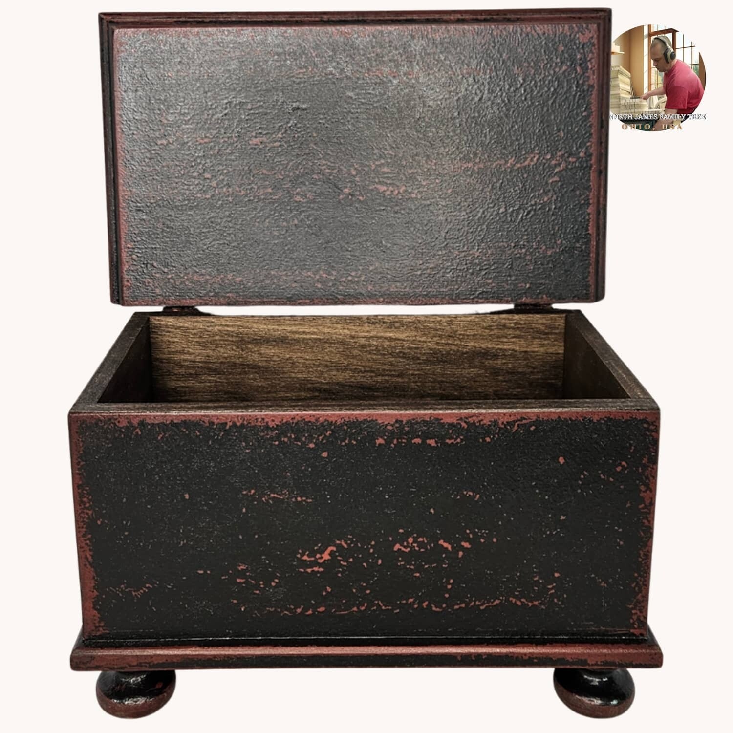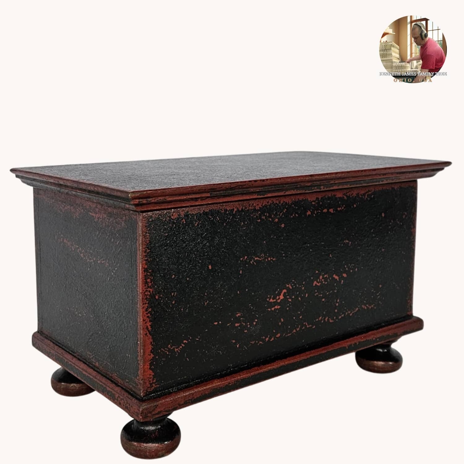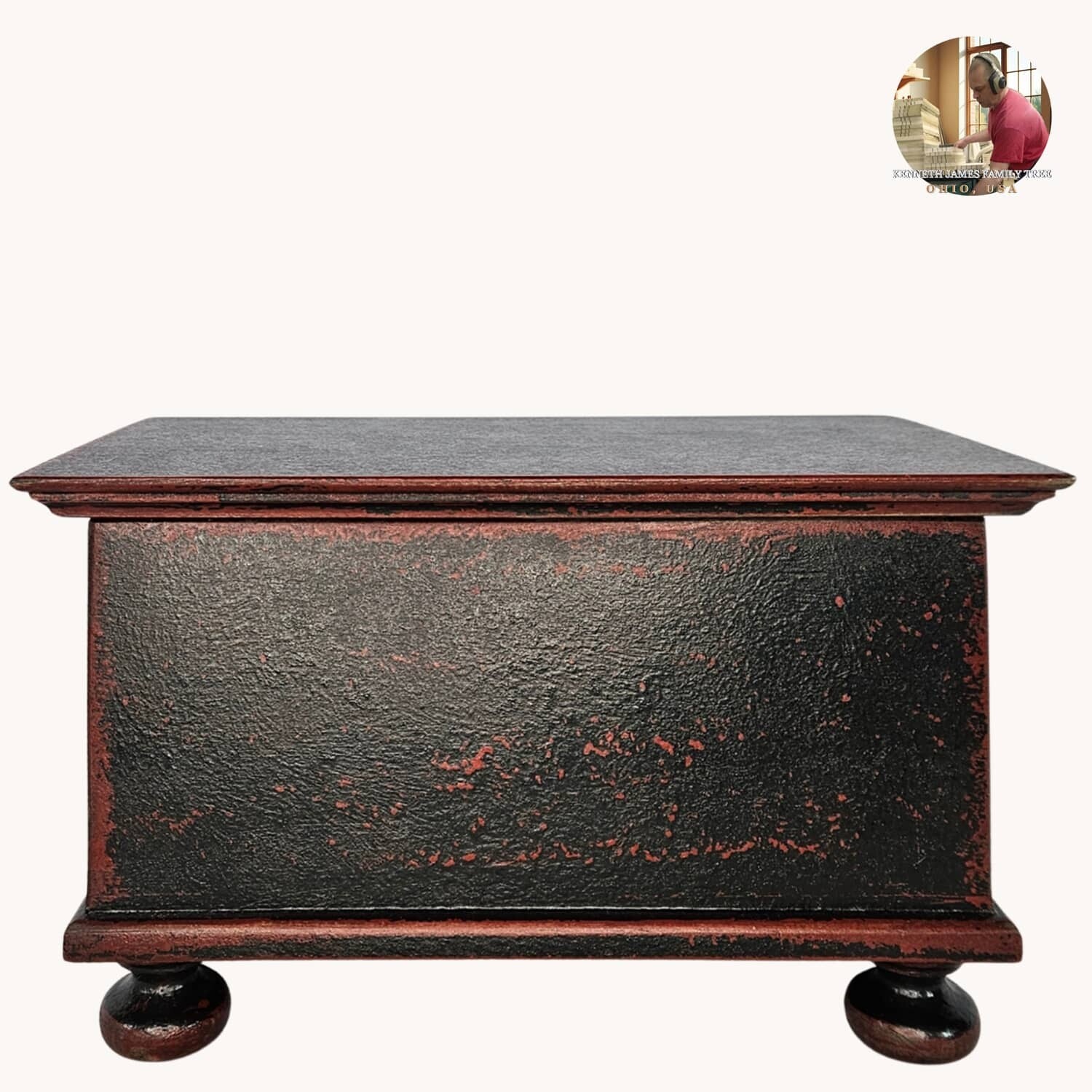 The Colonial Bunfoot Box is a traditional addition to your home. Sure to bring a beautiful touch on a table or dresser. The black over red finish is stunning. Made of Poplar wood in the workshop of Kenneth James. Made in the USA.