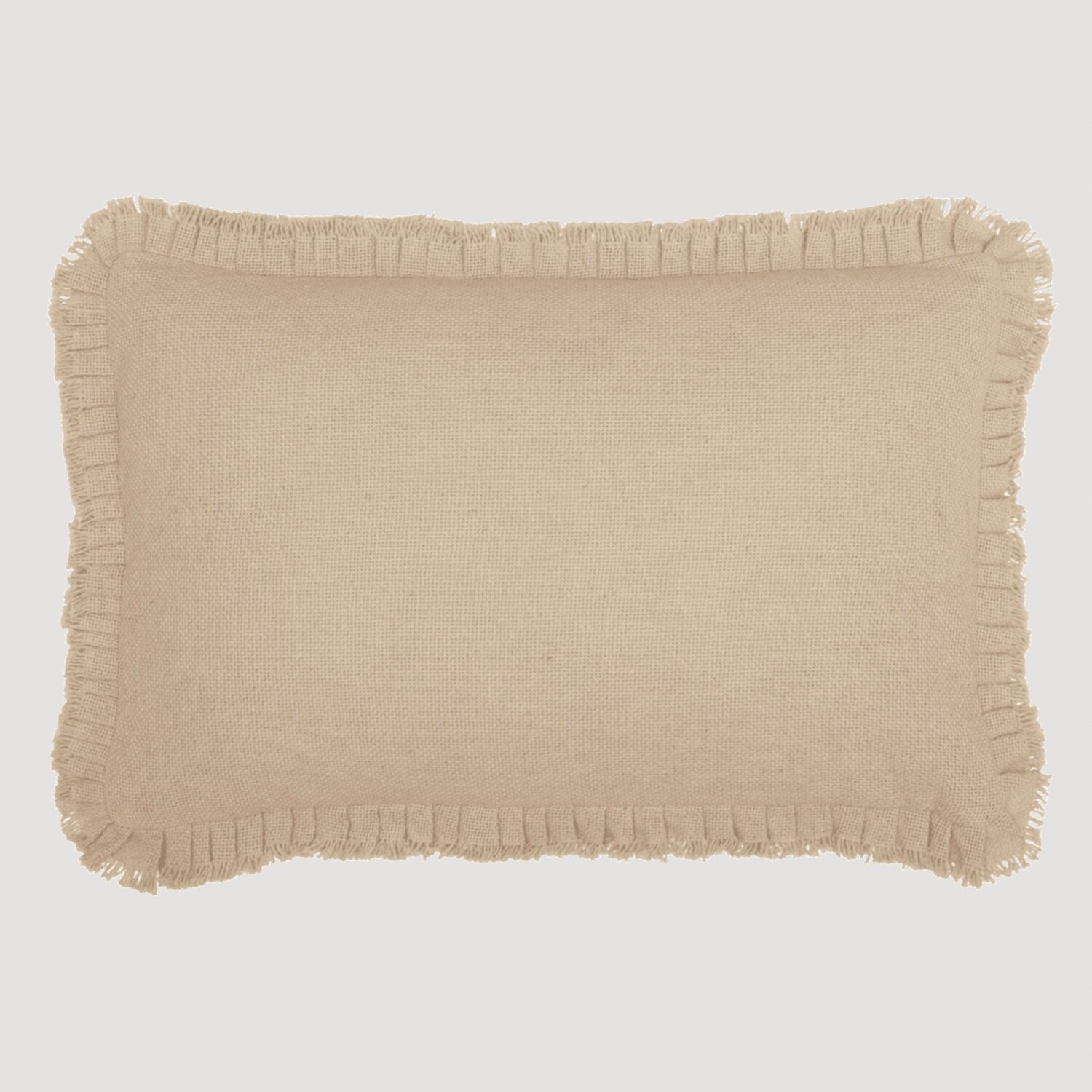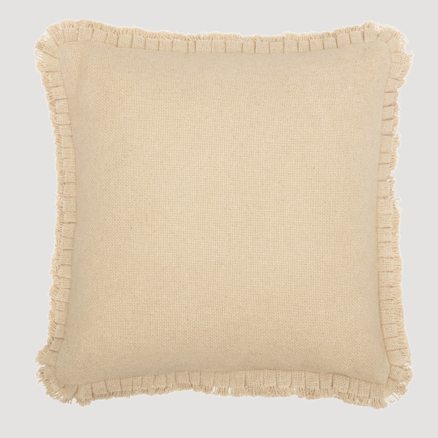 Lots of versatility and style, the Burlap Vintage Pillow with Fringed Ruffle. Featuring soft cotton vintage tan burlap with pleated & fringed ruffle, reverses to soft vintage tan burlap with 2 light wooden button to complete the farmhouse look.