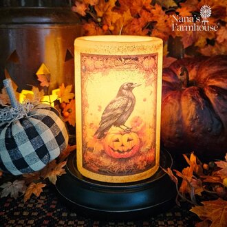 A spooky mansion is front and center against antique vanilla background of this candle sleeve. Ideal for Halloween decorating. In stock and ready to ship.