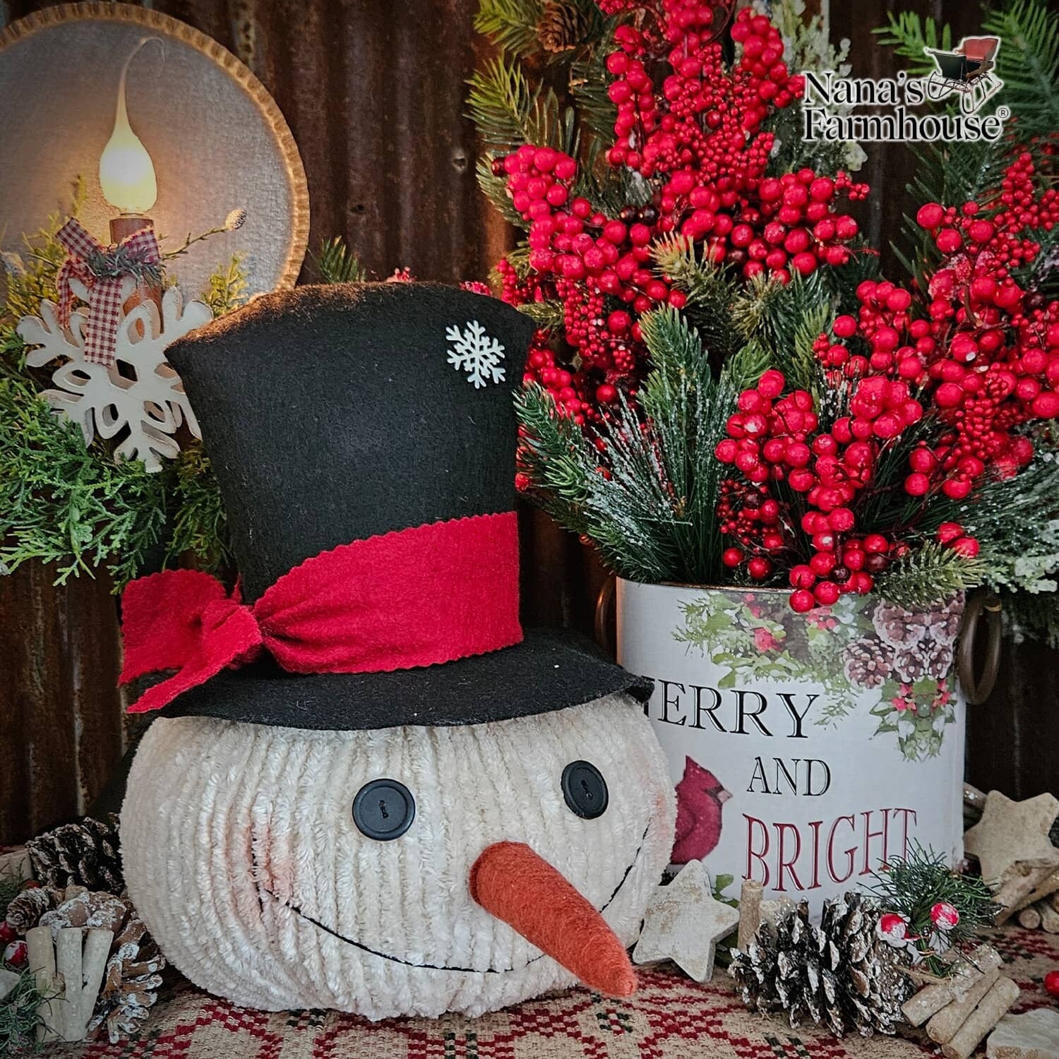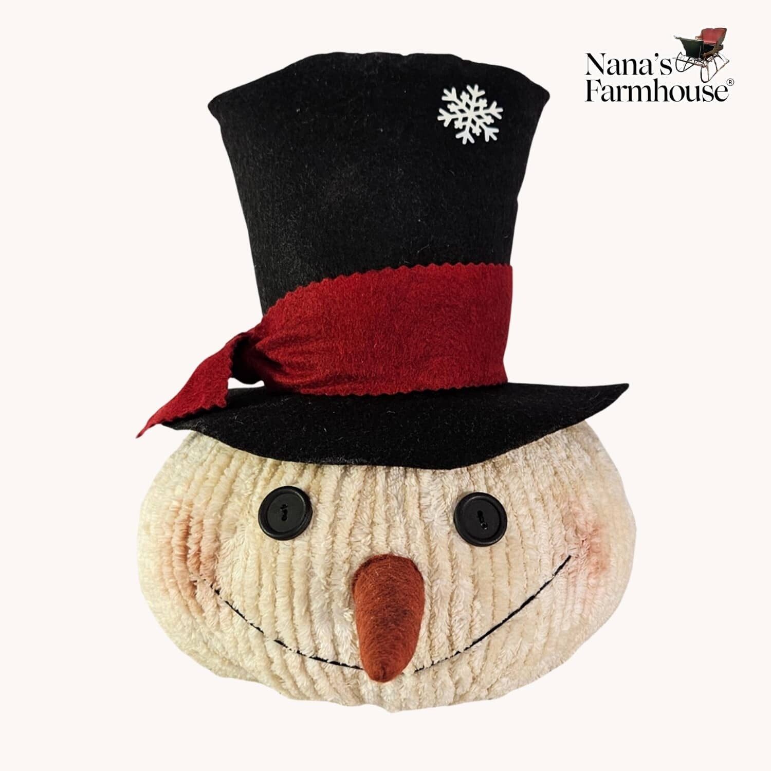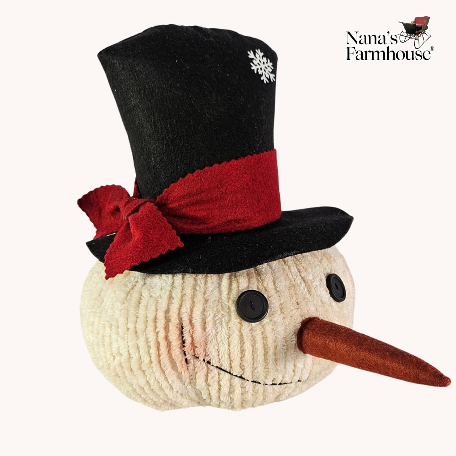 Big Joe Snowman head is made of chenille and sporting a black top hat, 4 inch carrot nose and black button eyes. A mischievous smile is stitched onto his face. Each cheek has a hint of rosy pink. Beautiful burgundy hatband.