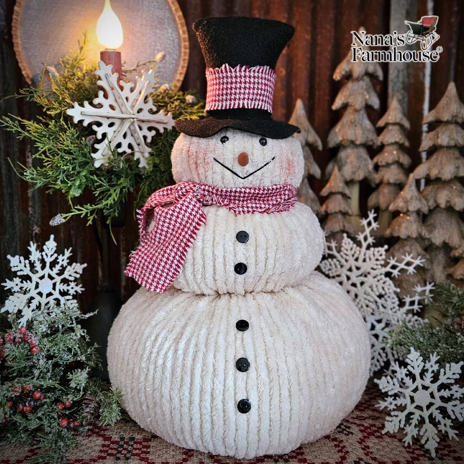 Availability: In Stock$24.99This Chenille Roly Poly Snowman with black top hat and red houndstooth scarf is 7.5 inches of pure sweetness and charm. Ideal to add to your winter decor. This jolly little snowman is sure to delight all who see him. In stock and ready to ship.Chenille Stacked Snowman Doll - Small