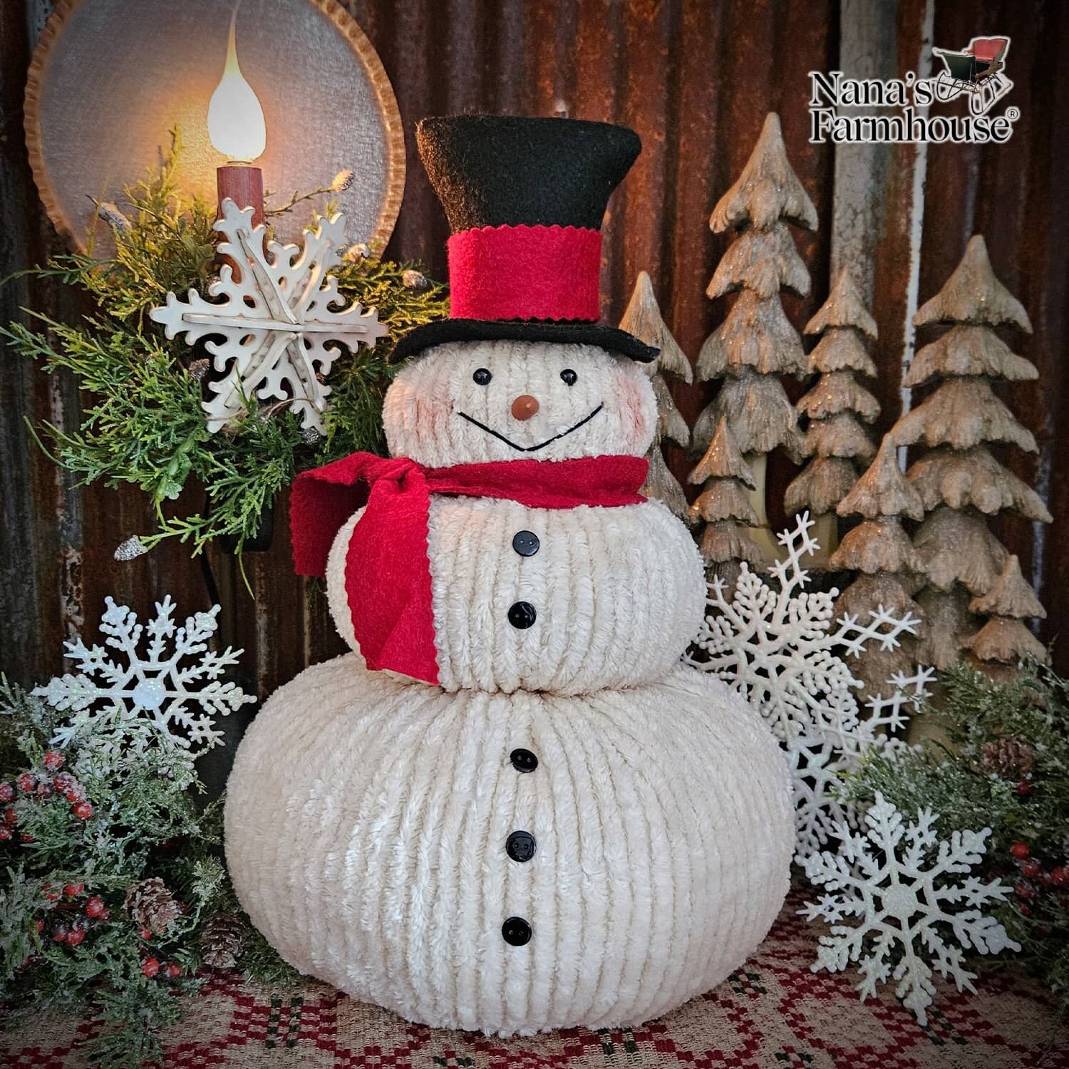 Availability: In Stock$24.99This Chenille Roly Poly Snowman with black top hat and red houndstooth scarf is 7.5 inches of pure sweetness and charm. Ideal to add to your winter decor. This jolly little snowman is sure to delight all who see him. In stock and ready to ship.Chenille Stacked Snowman Doll with Red Scarf - Small