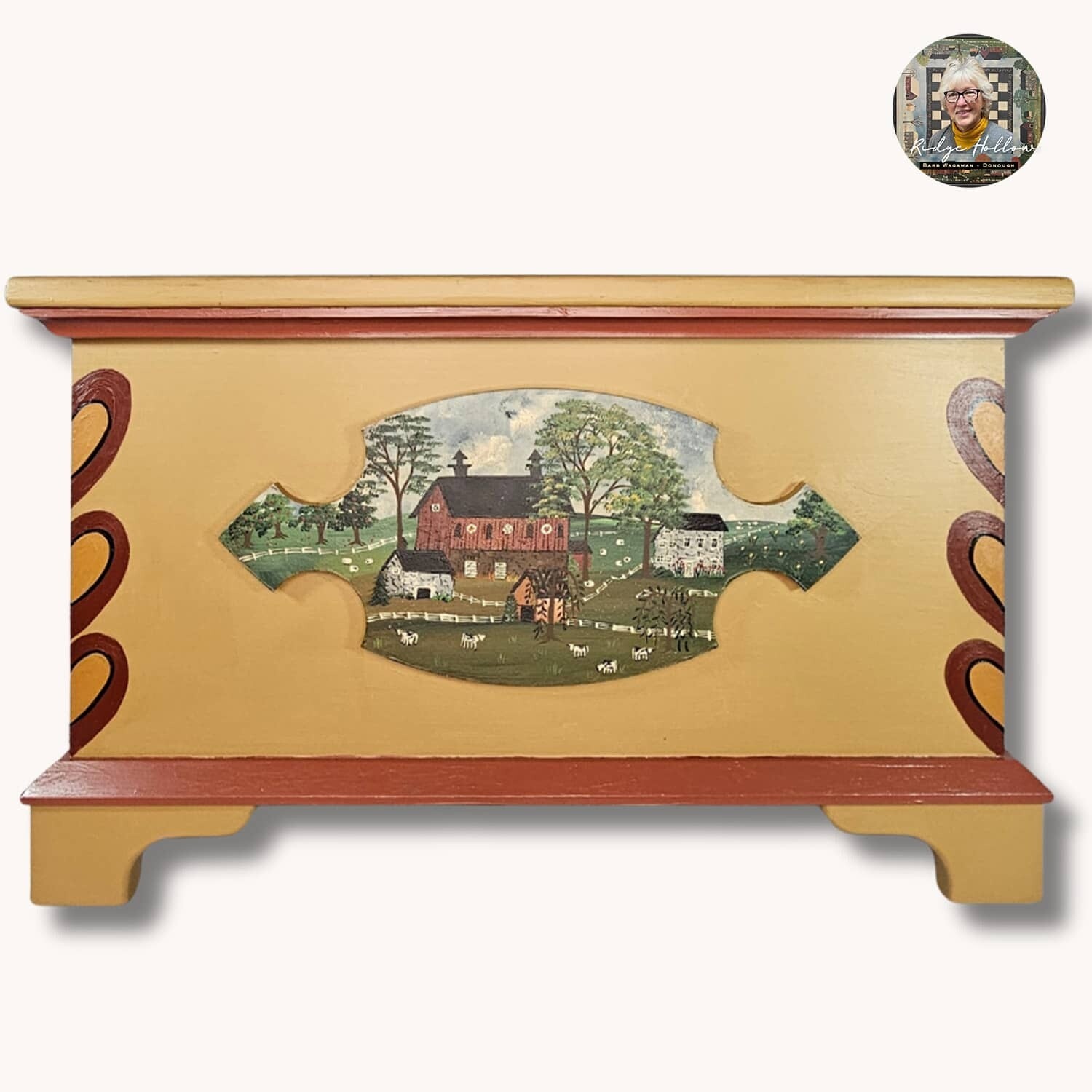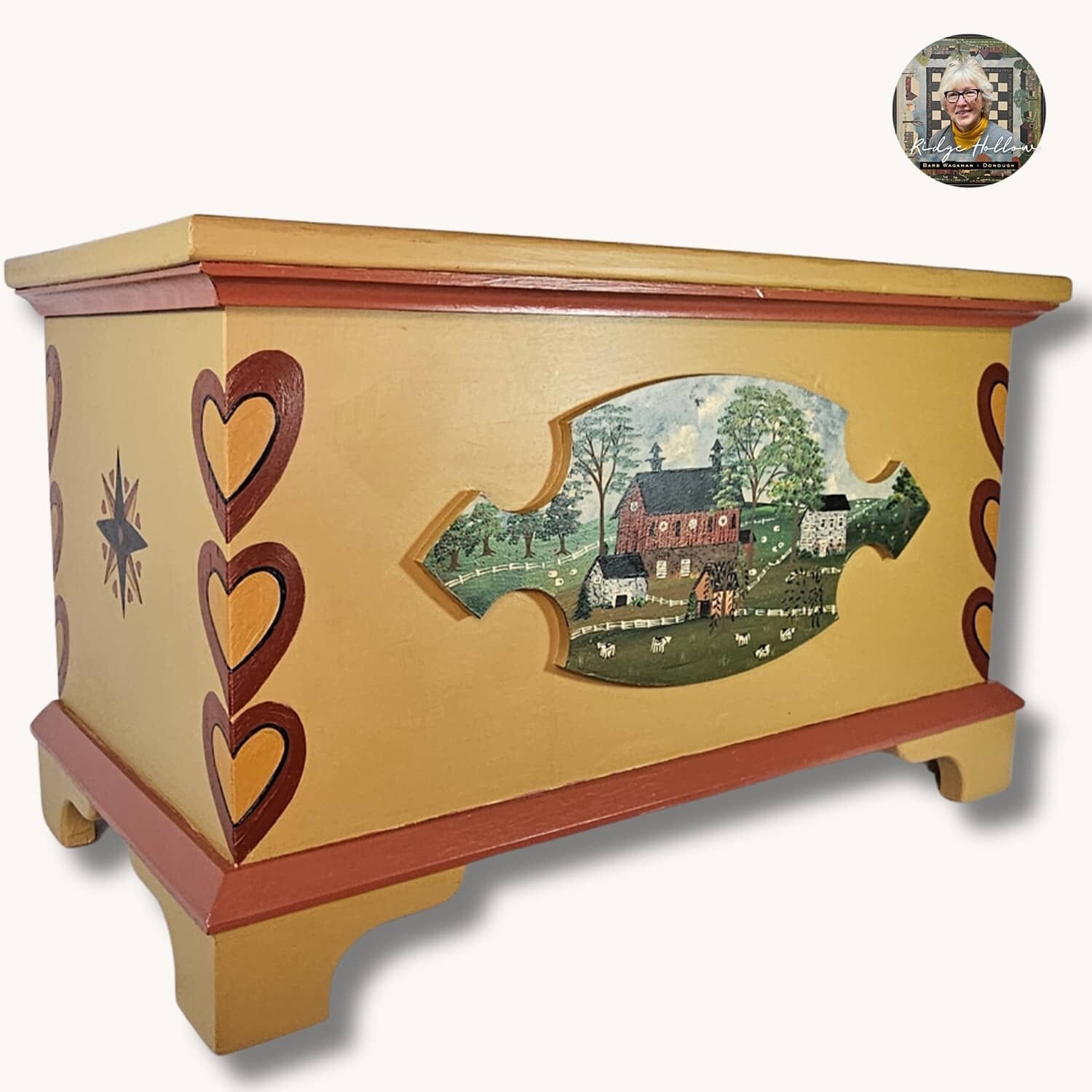 One-of-a-kind large Mustard trunk features hearts on the corners and a Barn scene. Hand-painted and made of solid wood. Finished inside and out. Due to size and weight this is for local pickup only.