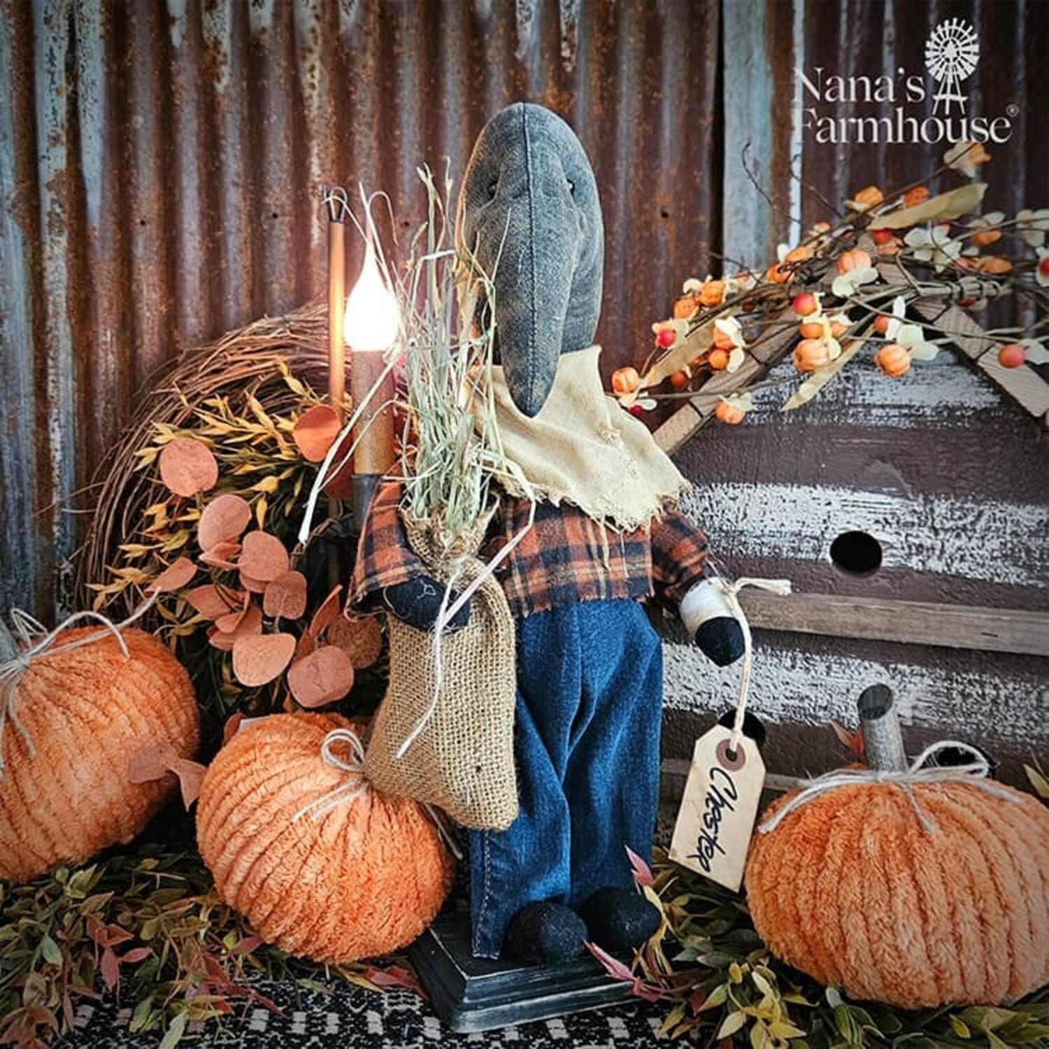 Chester is ready for a cool Fall day. Dressed in his plaid shirt, holding a bag of grass. Handmade in the USA.