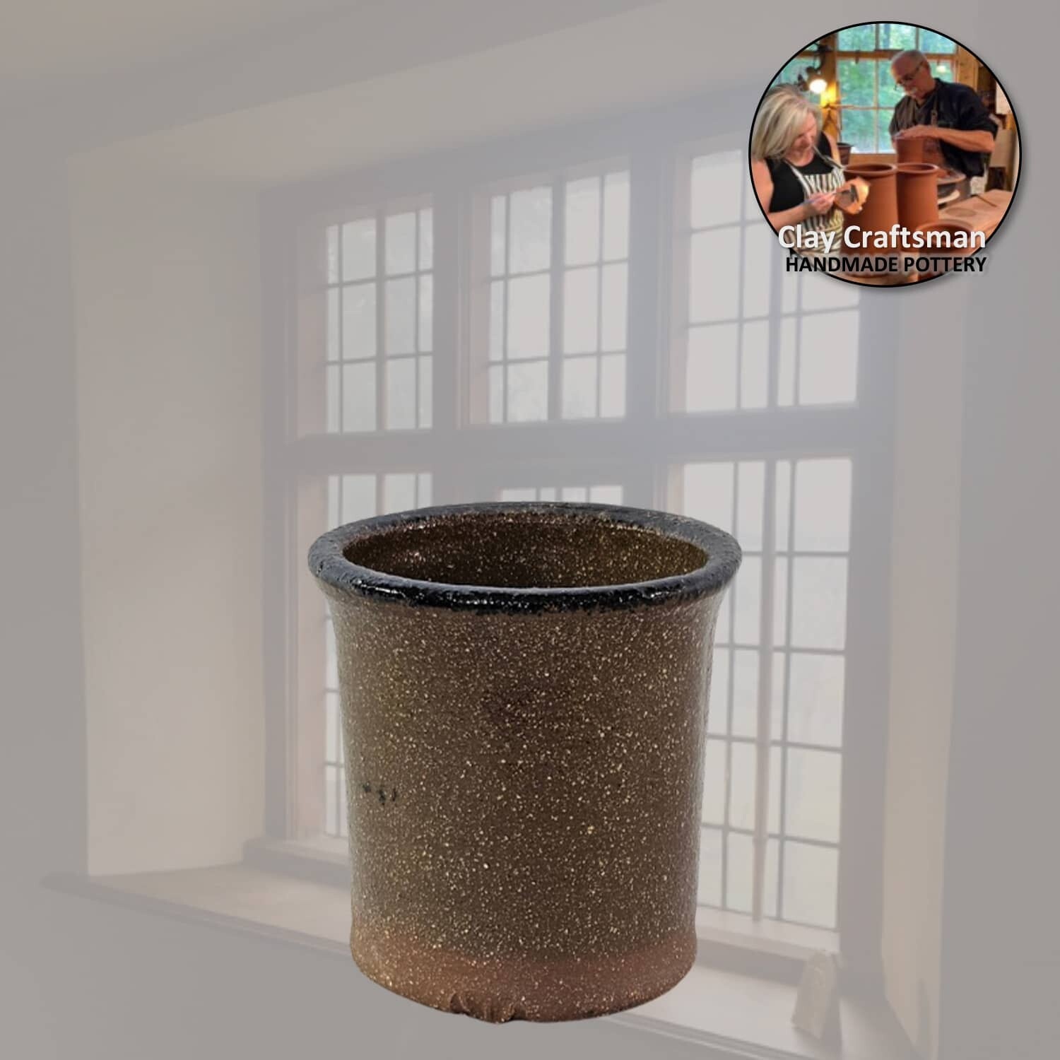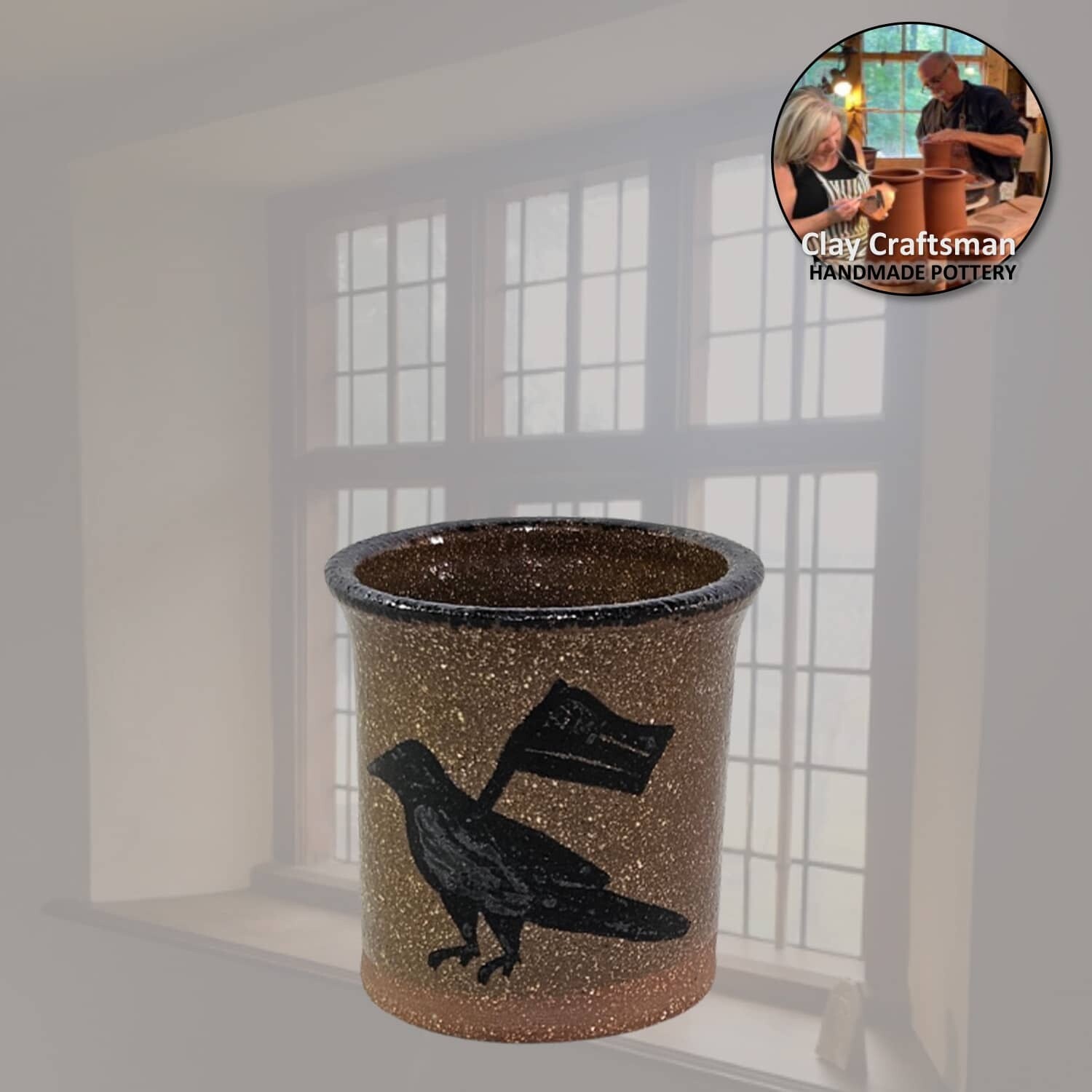 Touch of American with the Crow and Flag! This mini brown Pottery crock was handmade in the USA.
