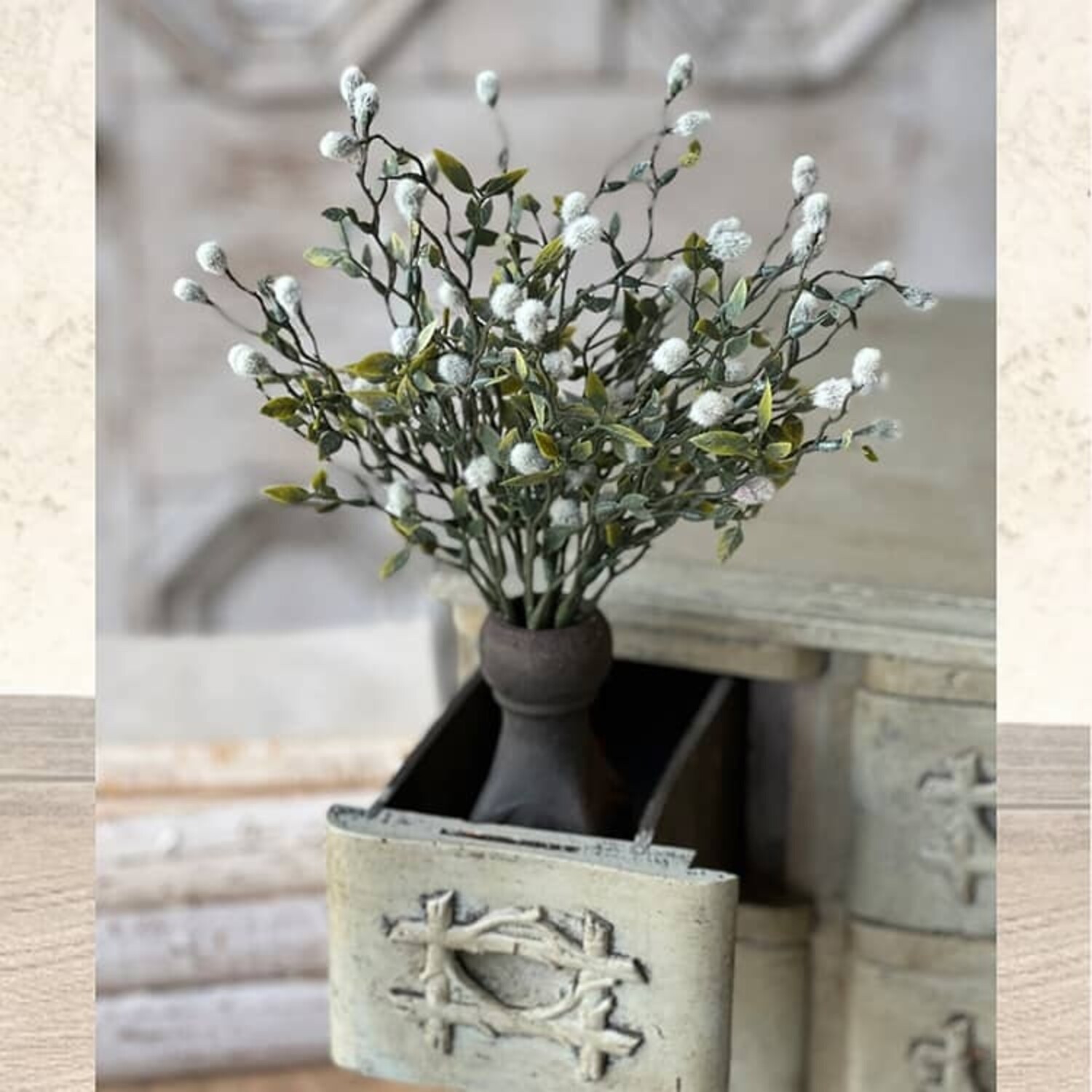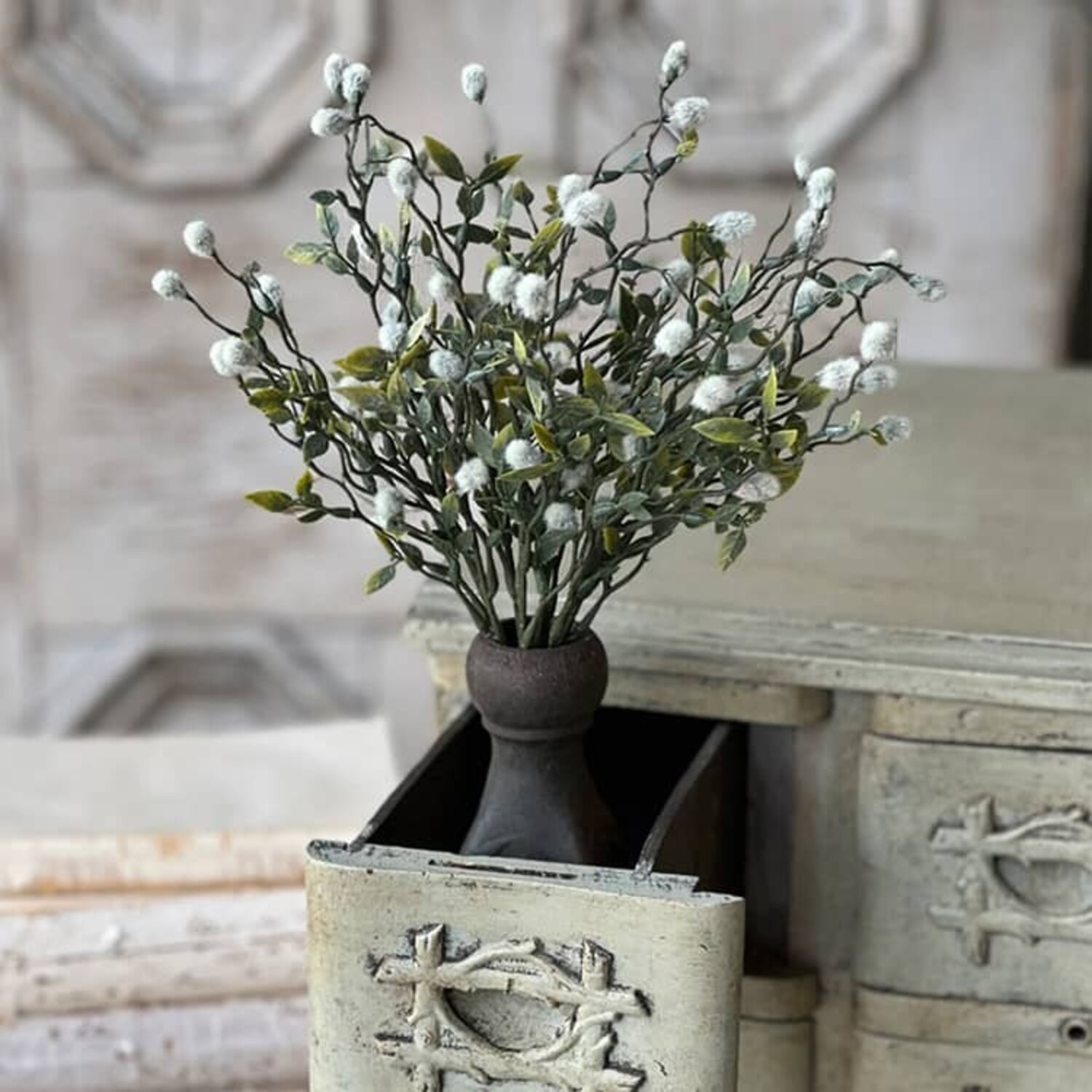 This beautifully textured botanical is such a fun way to bring a little life to a room! Soft, cloud-like catkins pepper the branching stems and tiny leaves, creating a cozy, natural addition to your everyday decor.