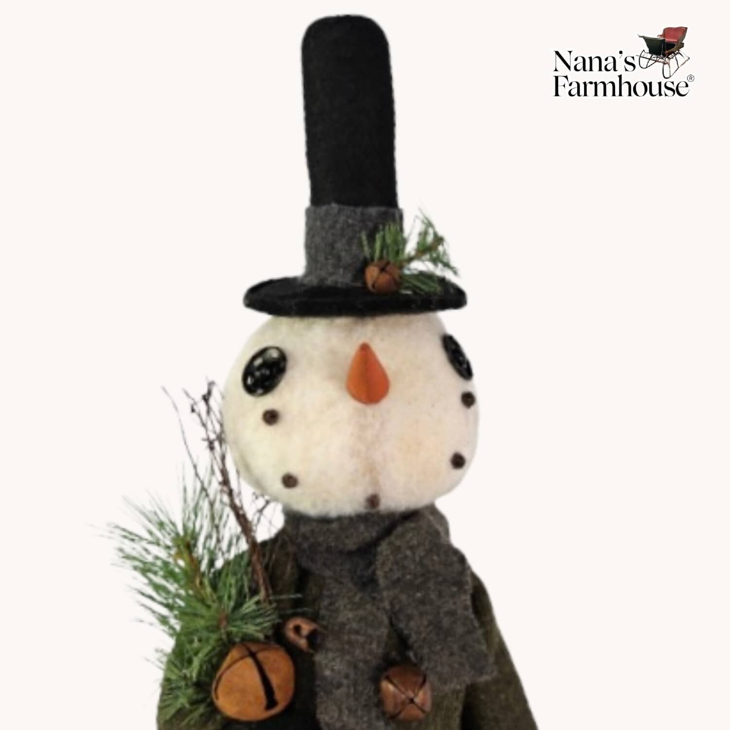 Holding twigs and greenery along with a rusted bell, Cooper makes a favorable impression with his black stovepipe hat, carrot nose, scarf, green wool shirt and brown plaid woven pants. Invite this snowboy gentleman into your home for the holidays!