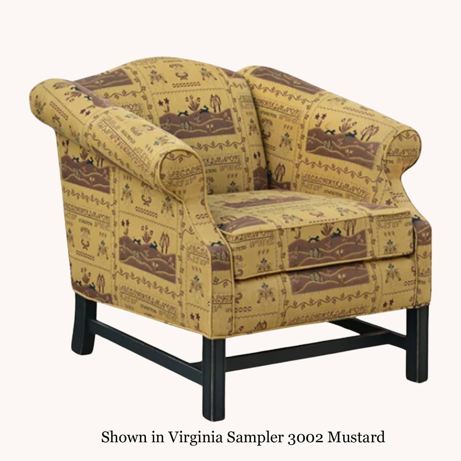 The Country Chippendale Chair is a cozy piece for your traditional home. Made of 8 way HAND-TIED coil spring seat foundation & other quality features with only the highest quality fabric. Shown here in Virginia Sampler 3002 Mustard.