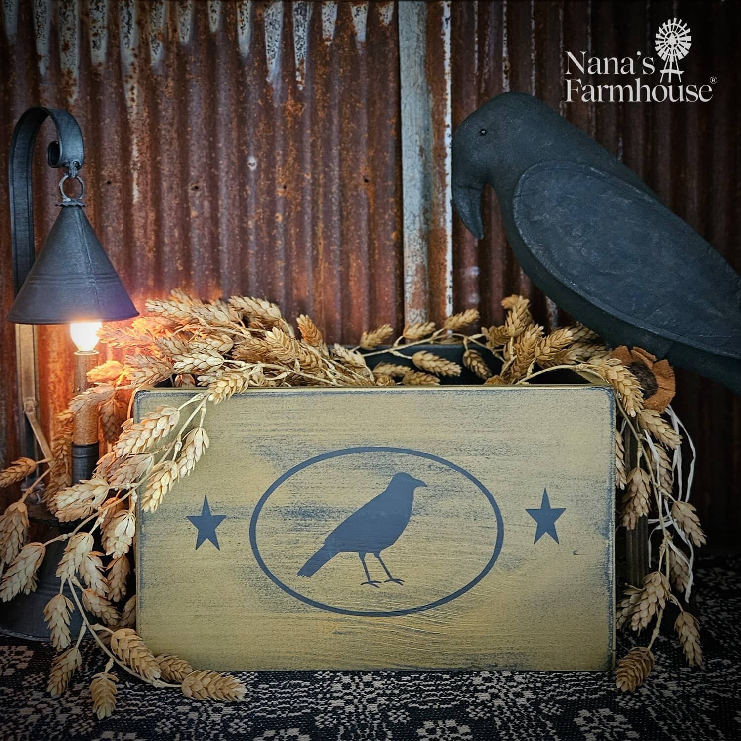 Everyone needs a box of a certain size to hold special items and this is that box. Mustard color, rustic, black crow and stars, ideal to fill with florals, tuck in a scarecrow, a pumpkins or buckets of gourds or ears of corn. In stock and ready to ship.