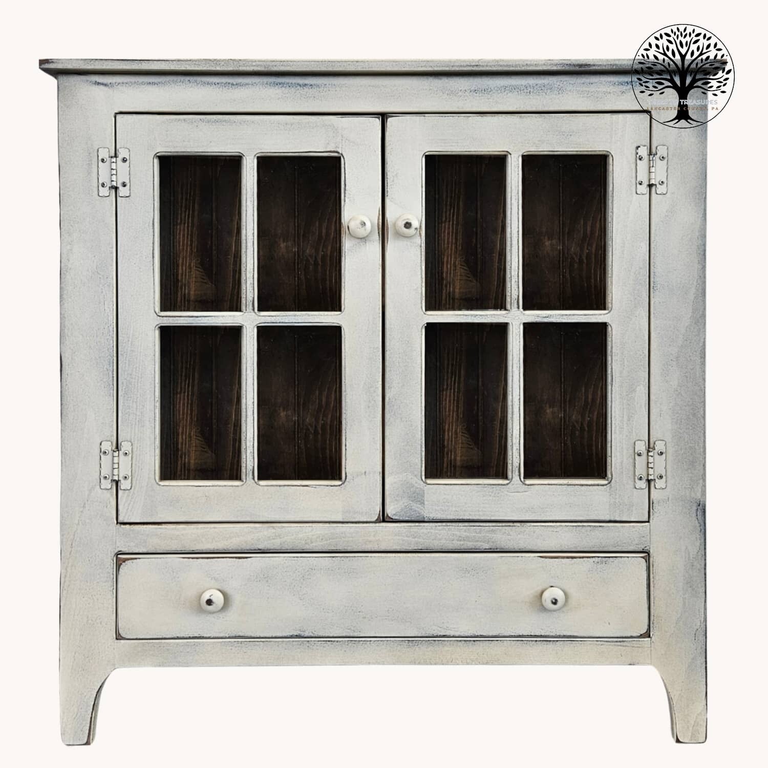 Charming Curio Cabinet in a distressed Buttermilk finish. Two Glass Doors allow for displaying your treasures. Drawer down below offers great storage. Made of solid wood in the USA.