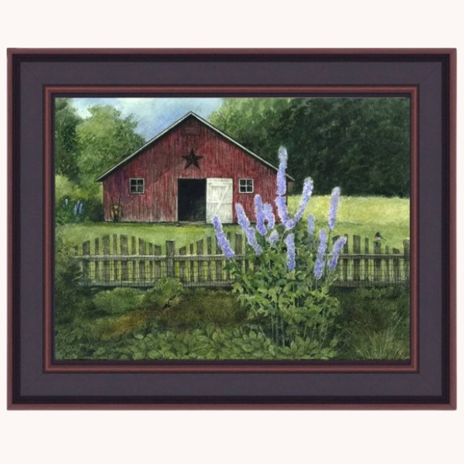 The beauty of the Delphiniums brings color and texture to the country setting. With the red star barn in the background and a deep forrest green this is a simple addition to your rustic home. 16" x 12" comes in Black and Walnut frame.