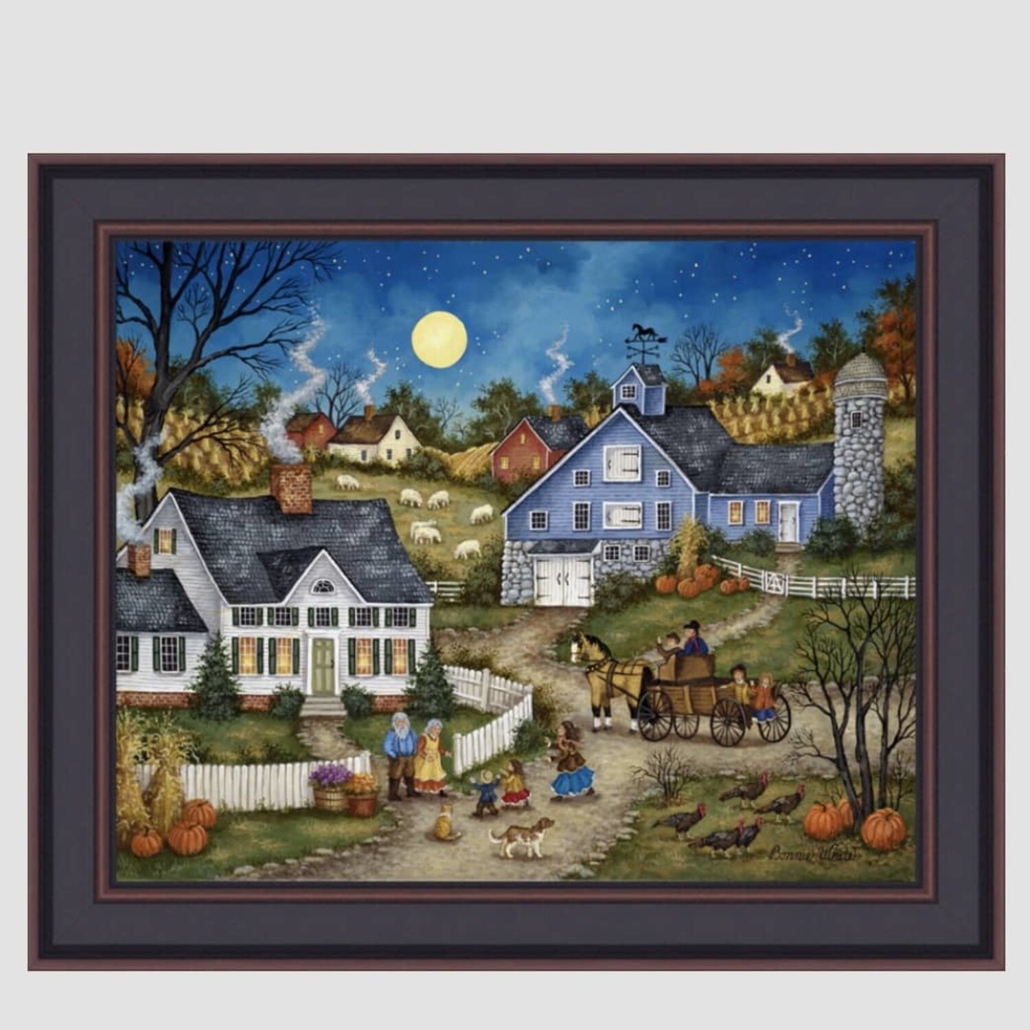 Artist Bonnie White captures a cool Fall evening under a full moon with her watercolors. Featuring pumpkins, corn stalks, sheep and horses. The children are excited to see their grandparents. Comes in black and walnut frame.