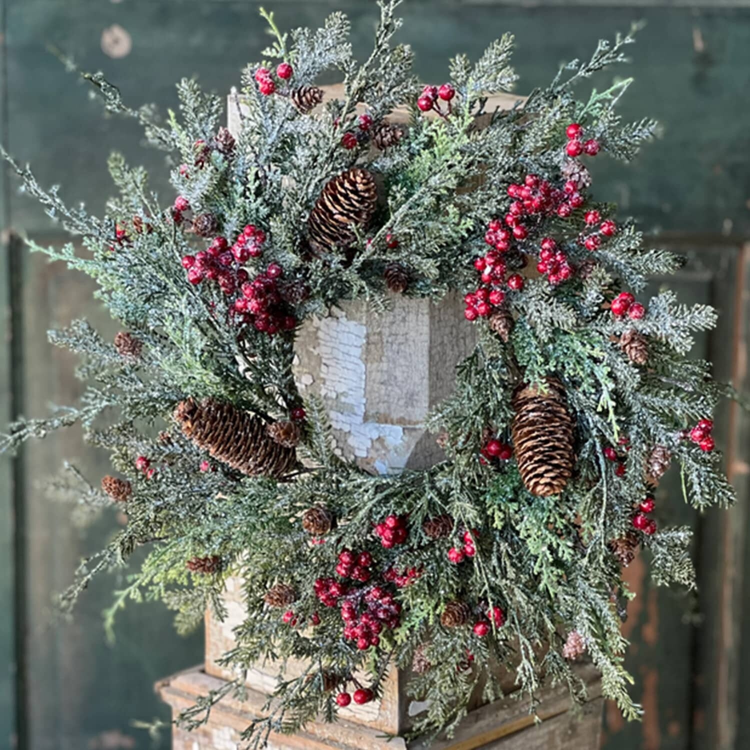 - Materials: Plastic, glitter, snow, styrofoam berry clusters, natural & faux pine cones, hard plastic faux base