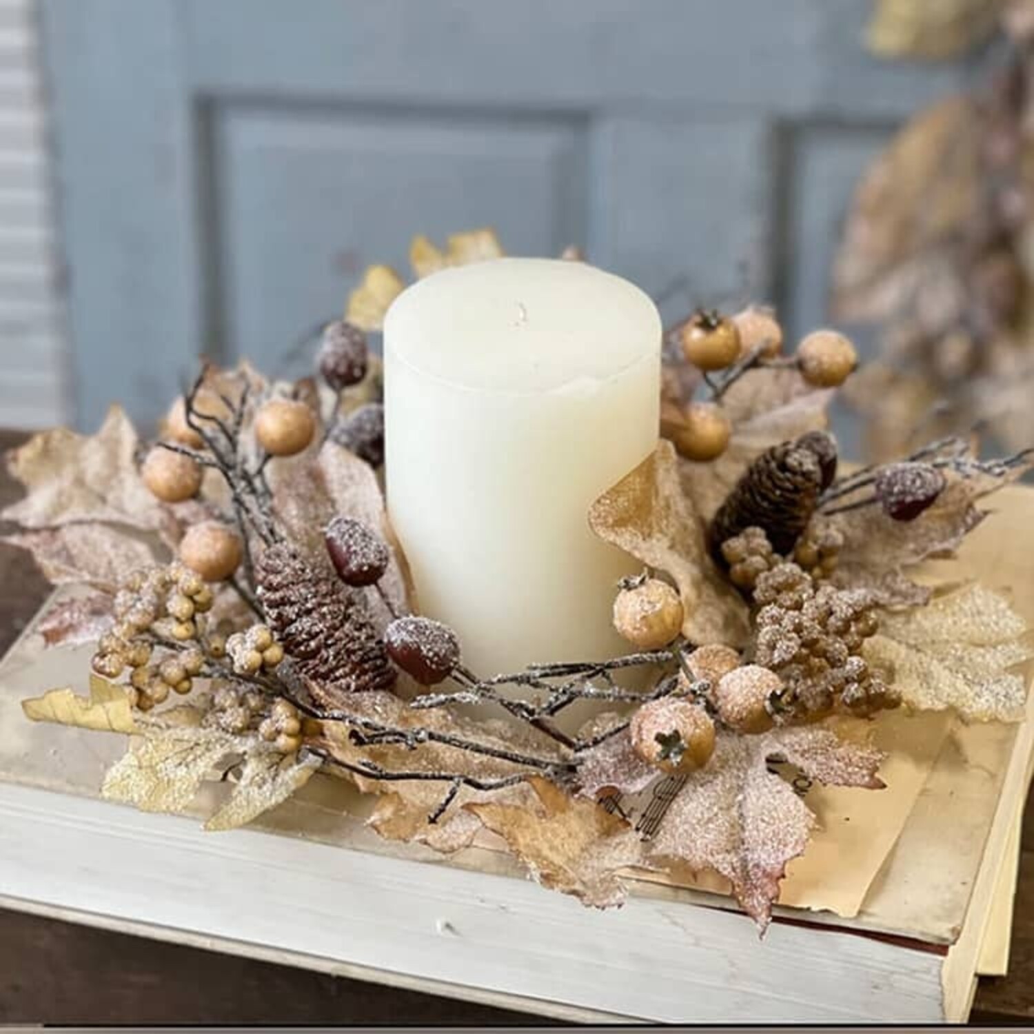 - Material: polyester, snow, iridescent glitter, styrofoam berries, plastic, natural pine cones, paper wrapped wire base