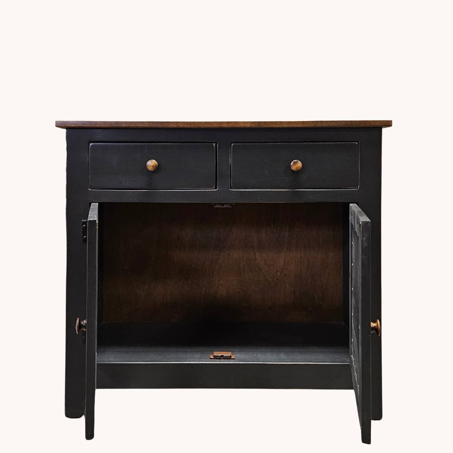This Farmhouse Black Cabinet is beautiful and functional. Features 2 doors and 2 drawers with Old Mill design punched tin inserts. Versatility and great storage option. Made of solid wood. Use in a kitchen, entry way or living room.