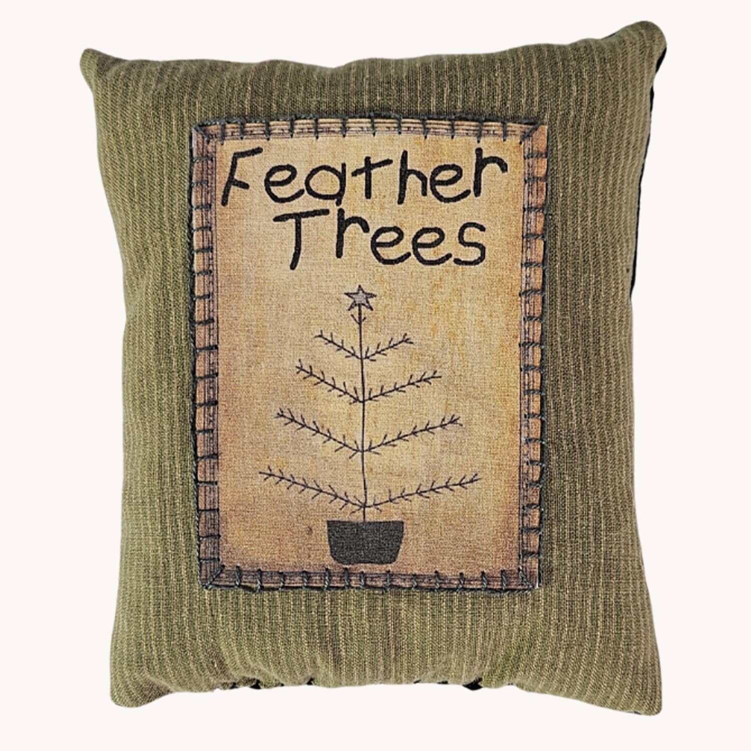 Rustic charm is evident in this feather trees bowl filler pillow. Appliqued onto olive green homespun fabric. Perfect for centerpiece or tuck into a bowl or shelf arrangement. In stock and ready to ship. Handmade in the USA.