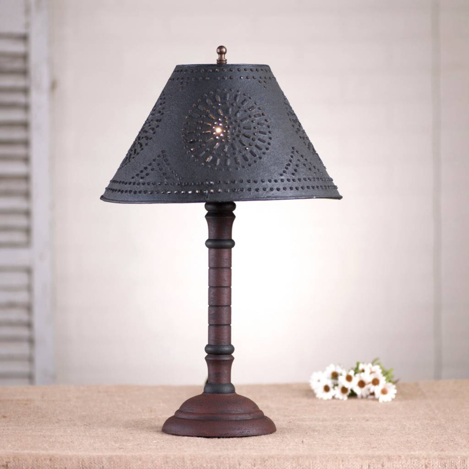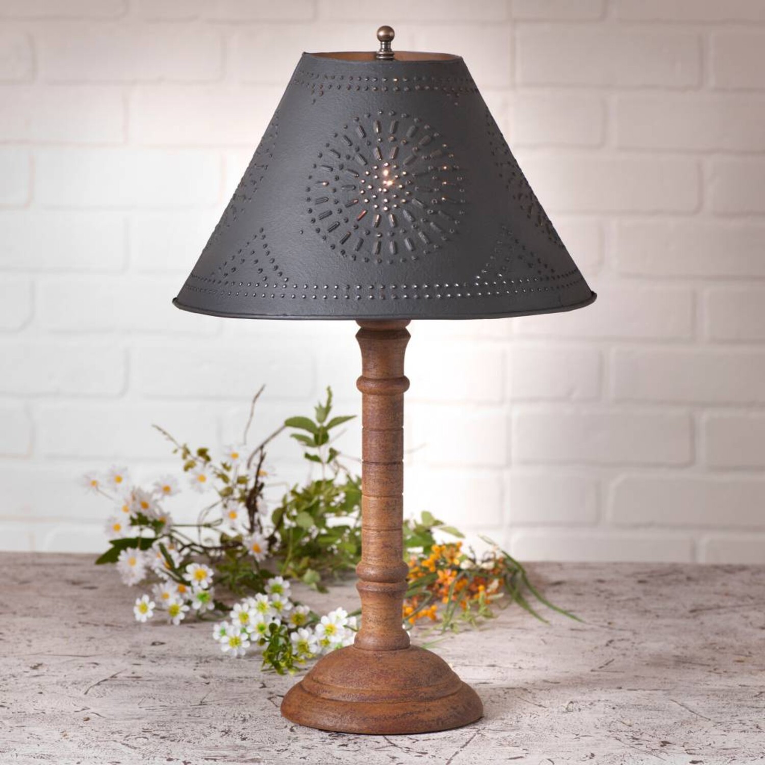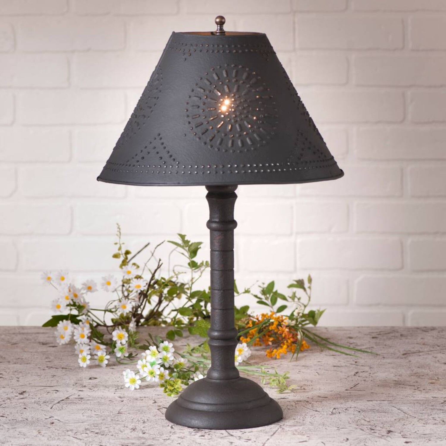 One single standard socket, 150 watts maximum. Heavily distressed and crackled body color. Handcrafted in Pennsylvania. Includes a 12-Inch Textured Black Flared Shade #925-1CBK. Lamp base without shade and alternate shade options are shown under related items below.