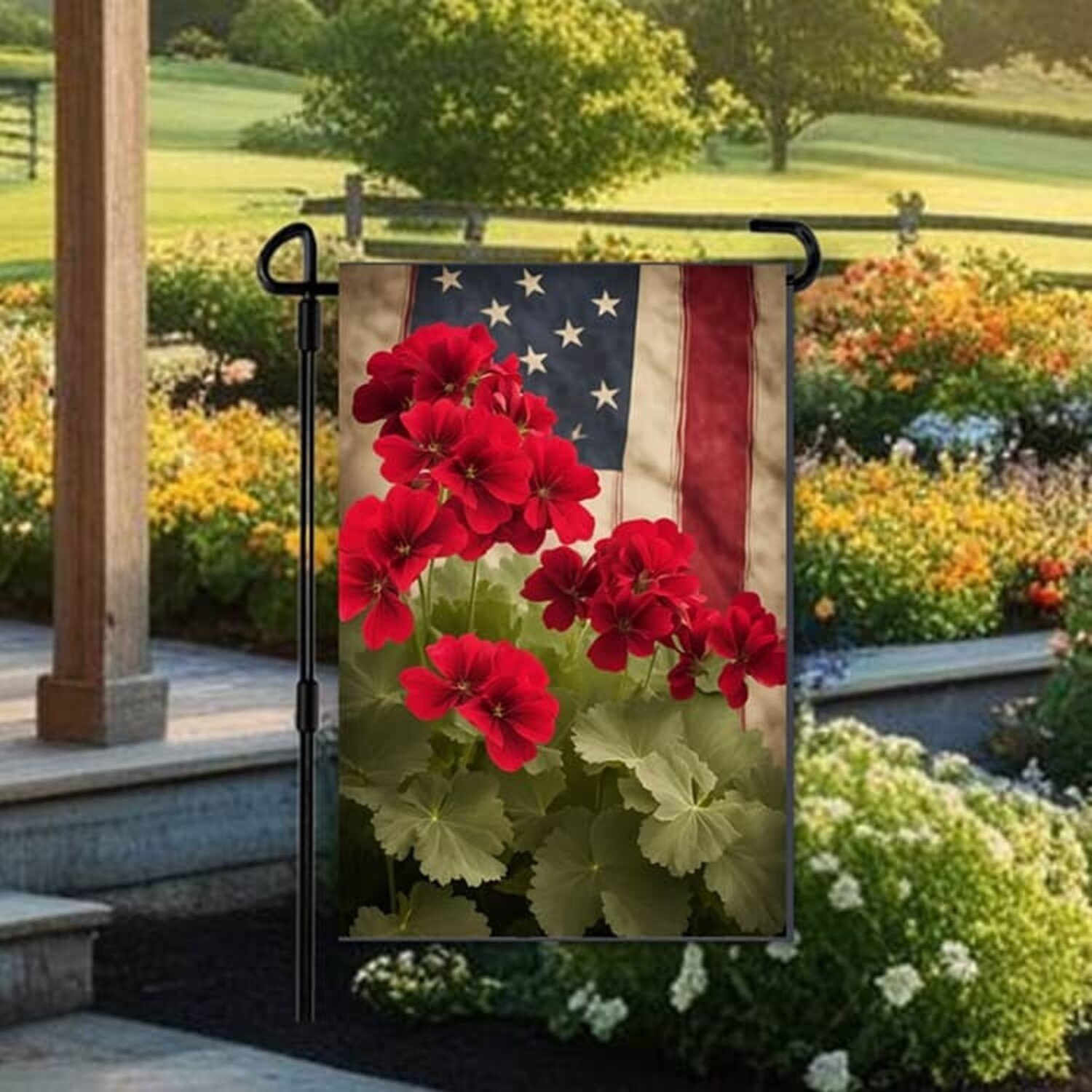 Geraniums & Americana Flag Double Sided Garden Flag - 17.25" x 12.5"