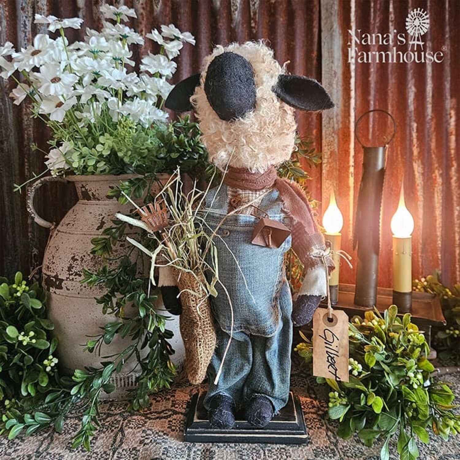 This handmade boy sheep features denim coveralls with a brown plaid shirt carrying a bag of straw and pitchfork. Rustic charm for any farmhouse decor or spring display.