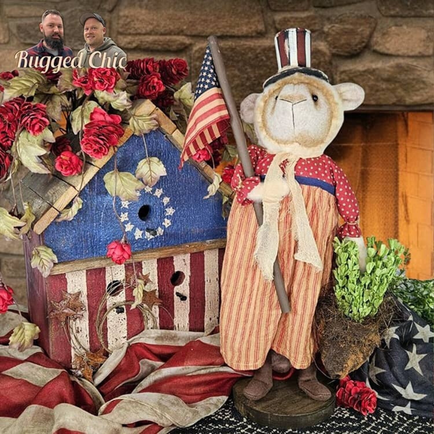 This charming girl lamb has the sweetest face, wearing a classic red ticking striped dress carrying a bag of greenery and American flag. Perfect addition for any shelf, hutch or display.