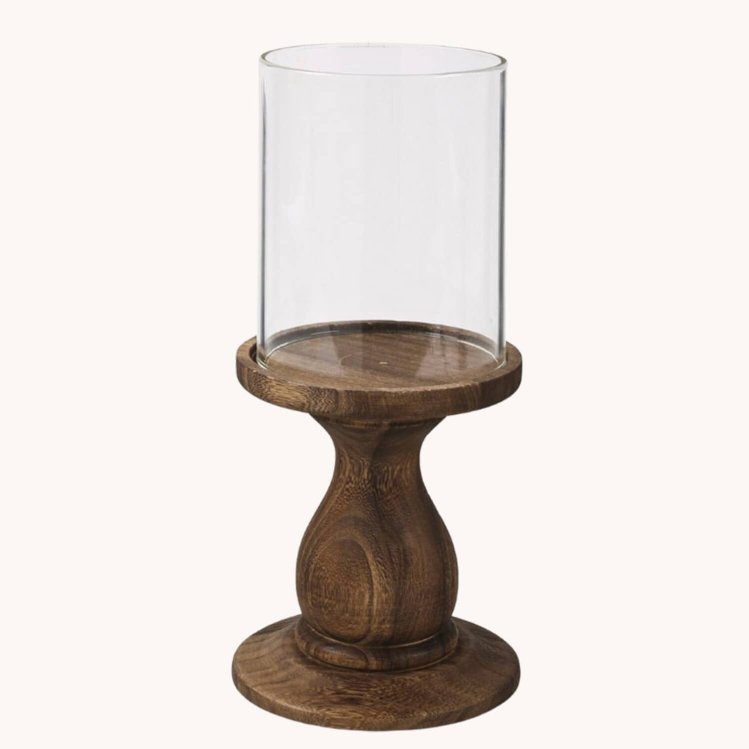 Add to your design and style with this Wood & Glass Pedestal Candleholder in large size! Use your favorite pillar candle and bring a warm and stylish glow to any space. Other sizes available.