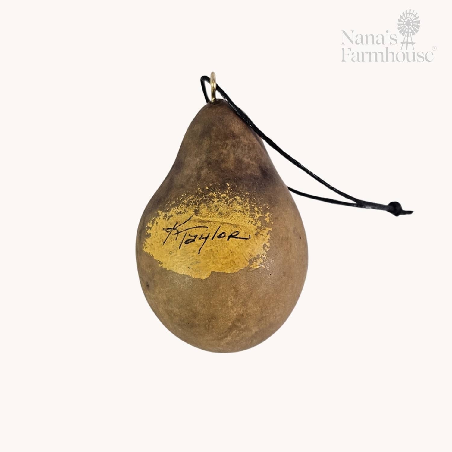 Orange background at twilight, offsets the black haunted house in this Halloween scene. This hand painted gourdament will add a spooky touch to your Halloween decor. In stock and ready to ship.