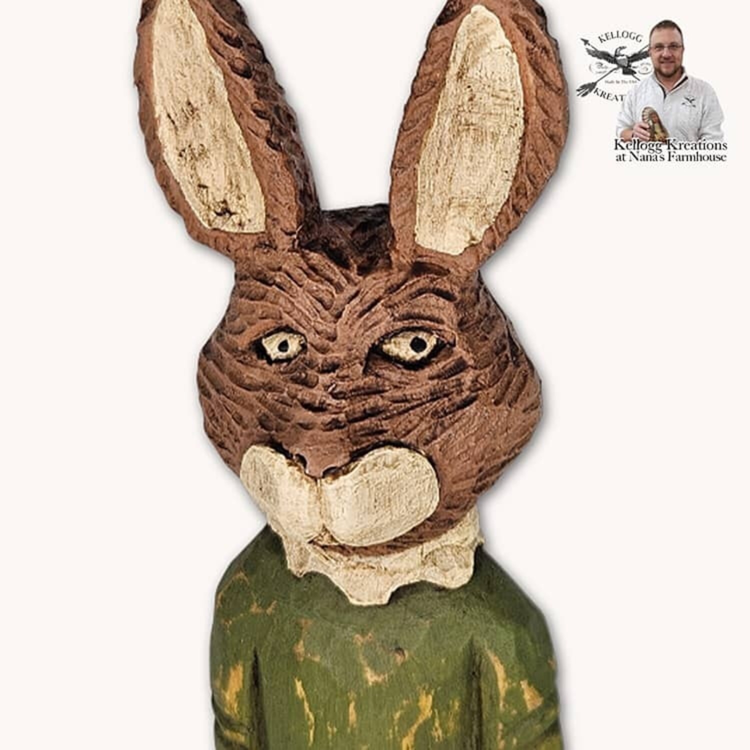 One-of-a-kind! Hand carved and accessorized with a wooden barrel of flowers. Her collar adorned with double-ruffles, darling turned-down socks show her personality. Made with love & attention to detail by Folk Artist Chad Kellogg.