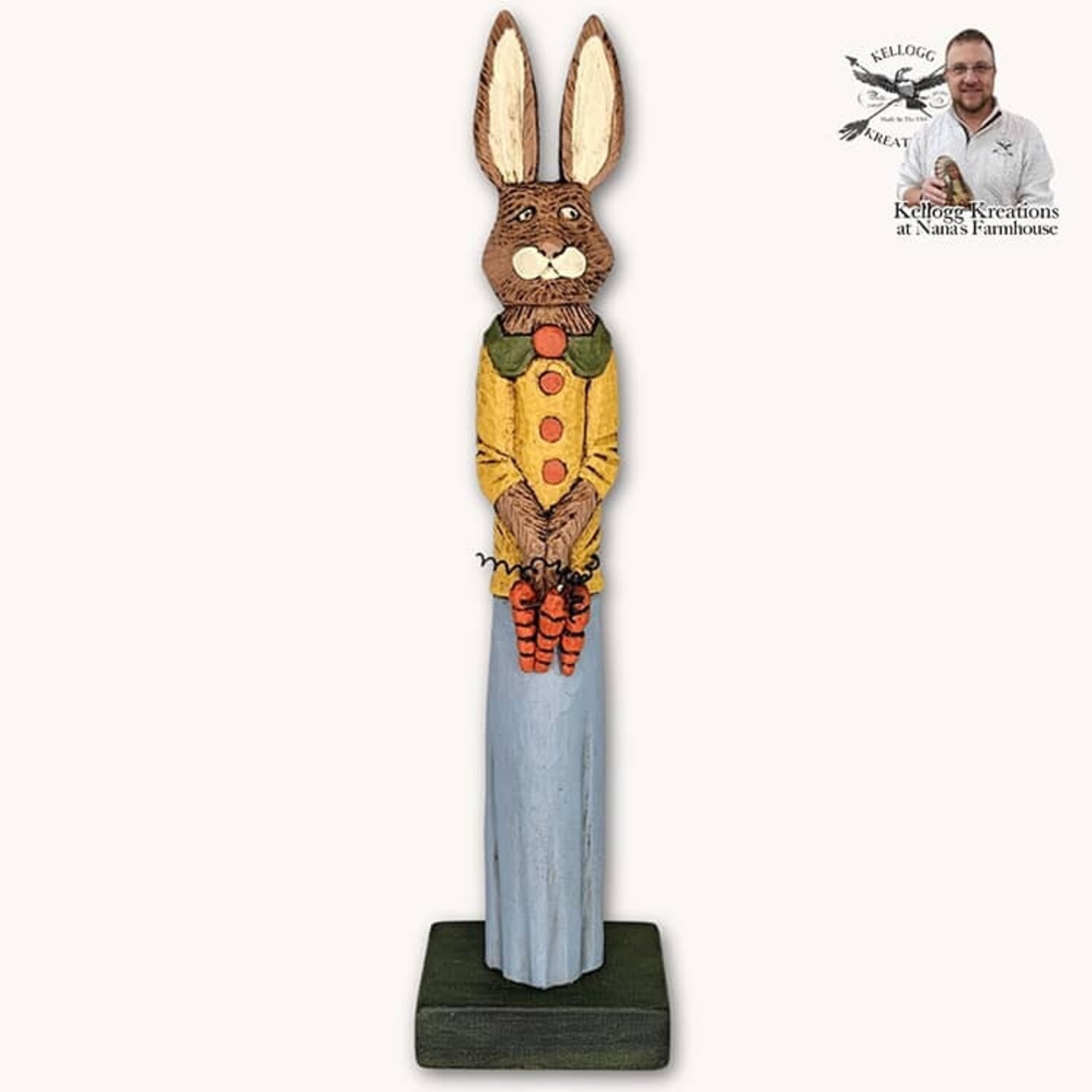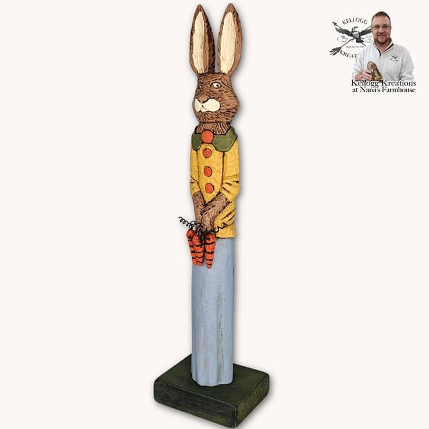 From the buttons on her blouse to the carrots she is holding, the details were not missed by our woodcarver, Chad.