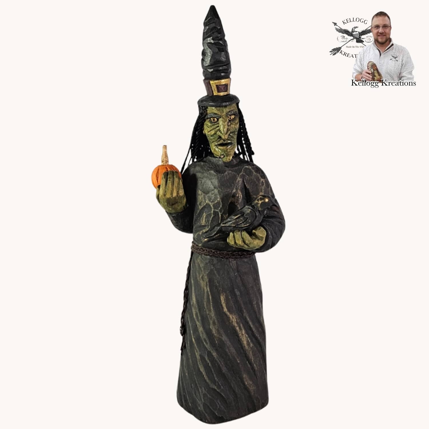 This hand carved witch with her green face and hands is so delightfully ghoulish, you can almost hear her cackle! Standing 13.5 inches tall, she holds an orange pumpkin in one hand and crow in the other. Beautiful wood carving artistry.