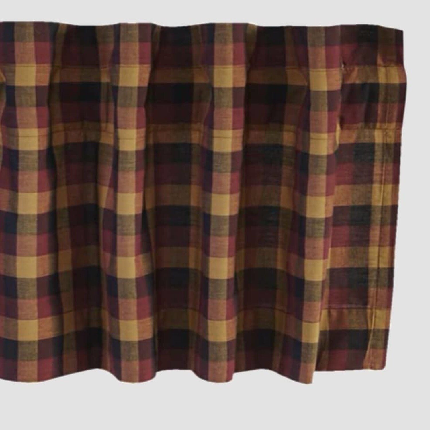 Refresh your country windows with the Primitive Check Valance. This lined valance adds a rustic look to any window with its large scale burgundy, mustard, and black check fabric all cotton. The set is lined in all white cotton. 3 sizes to choose from.