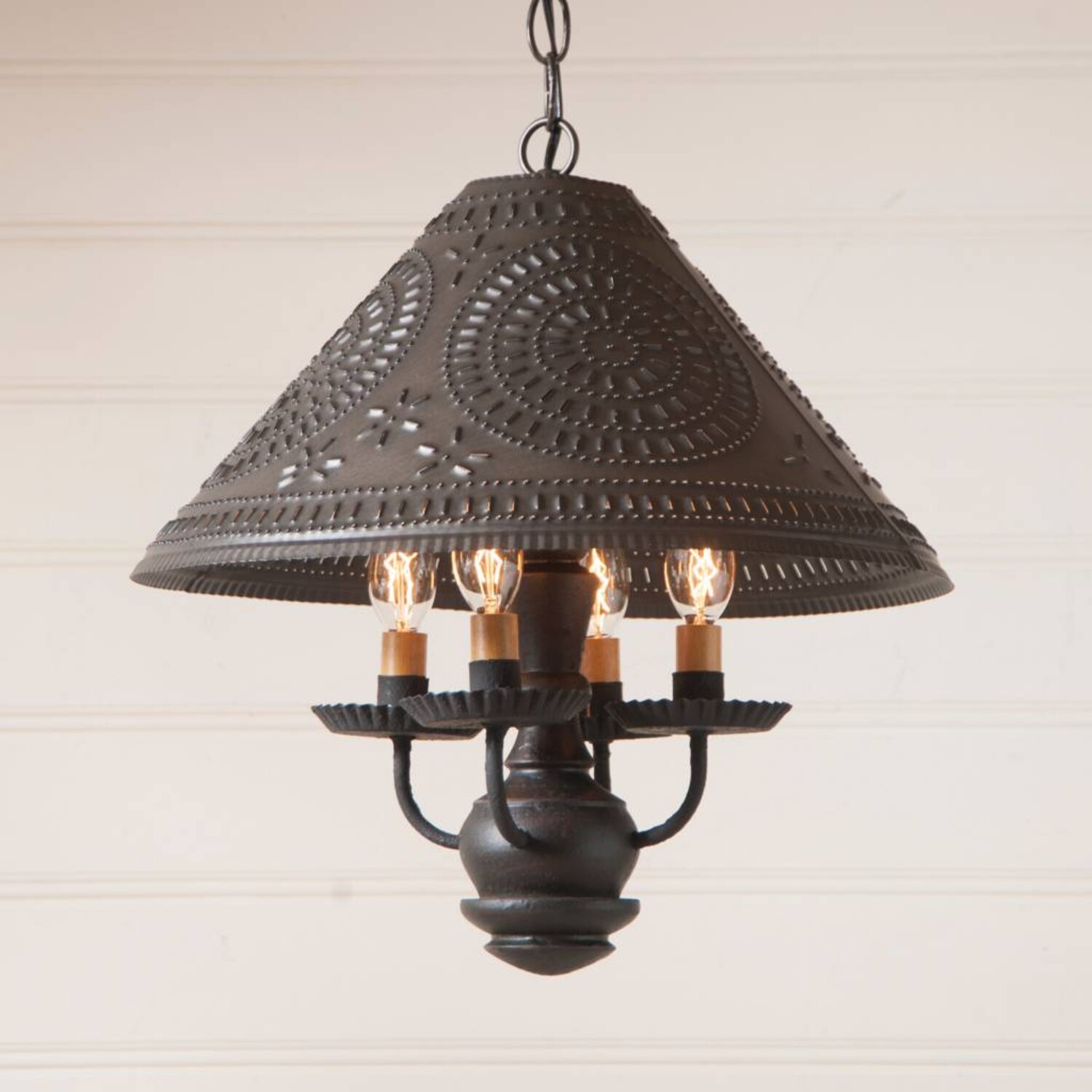 Direct wired with four candelabra sockets, 60 watts max. per arm. 7 feet of wire, 3 feet of chain, and a matching ceiling plate included. May order up to 12 feet of additional chain. Kettle Black shade with black textured arms and crimped pans. Handcrafted in Pennsylvania. This light is UL approved and has a 5 year guarantee.
