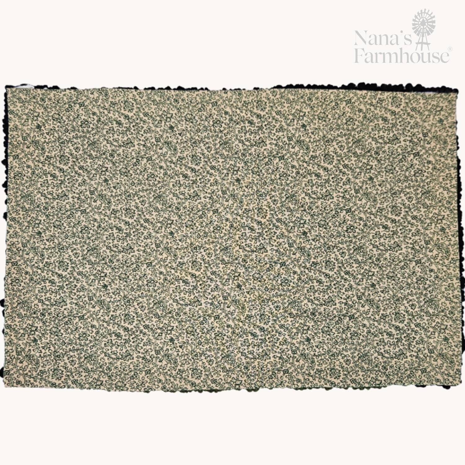 Primitive style Hooked Rug with a Log Cabin, sheep and greenery branch. Handmade in the USA.